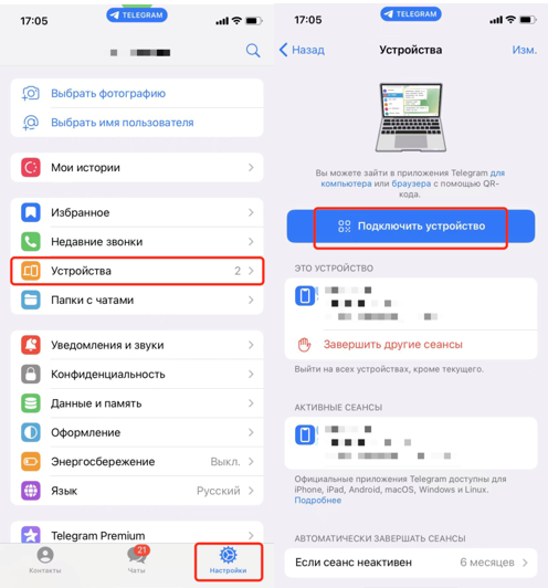 • 在智能手机上打开 Telegram 并转到设置。点击“设备”→“连接设备”。该程序将启动 QR 码扫描仪。