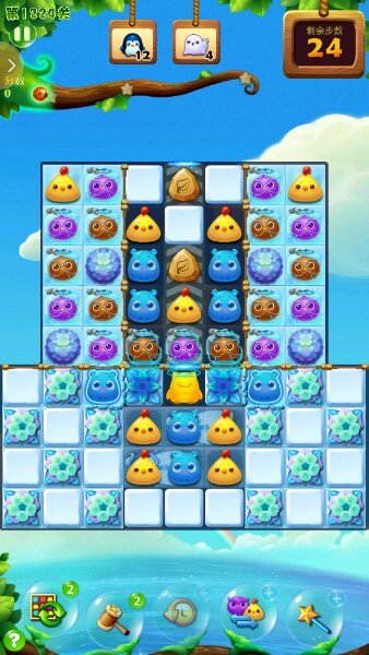 2:底部以组合横向特效魔力鸟为主,不用刻意消除大眼仔。上方消除魔法石带动连消组合魔力鸟和两侧竖向特效为主。目的快速消除底部雪块和蜂蜜罐头。