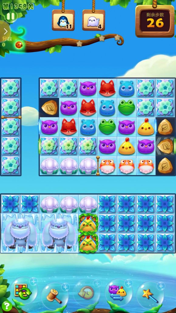 3:雪怪消除以后右上方会被小叶堆全部覆盖!这个时候得迅速激活水母宝宝。触发水母宝宝为主,竖向特效辅助,快速把上方水母宝宝打出来。