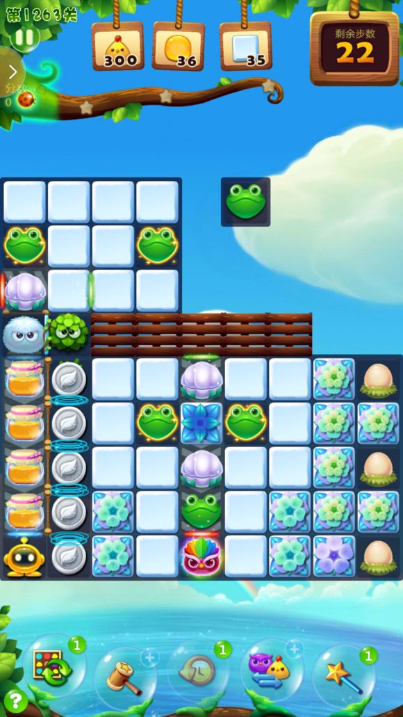 此关卡过关目标22步之内消除300只小黄鸡36蜂蜜和35雪块。