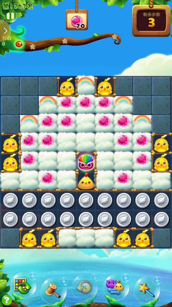 5:最后阶段,消除鸡窝出小黄鸡触发雷电鸟,这个是必须的。如果没有直接触发雷电鸟,只能继续消除鸡窝,或者组合魔力鸟换小黄鸡。