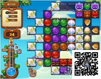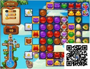 这关特效步是很难得,因为每次蛋壳释放的小黄鸡都比较多,我们将右上角的两个魔力鸟交换,任务就完成的差不多了,最后在利用水母完成任务。