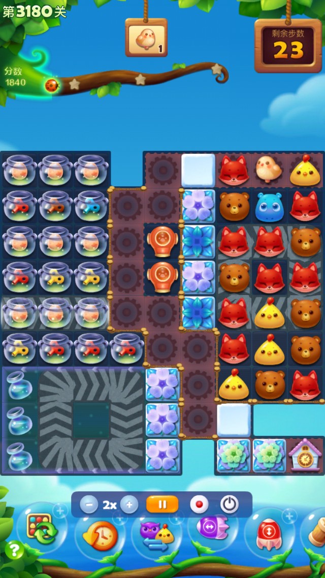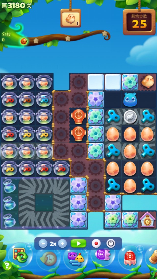 固定开局,右上角三消,消除鸡蛋,收集钥匙,让小鸟移动,动物充满右上角,消除冰层雪层,激活章鱼,消除中间下方冰层雪层,让动物充满左下角,收集魔法药水,为魔法瓶充能,打破魔法瓶,有可能是钥匙,有可能**蛋,不管怎么说,尽可能快速收集钥匙,送小鸟回家,三星不易祝福好运!