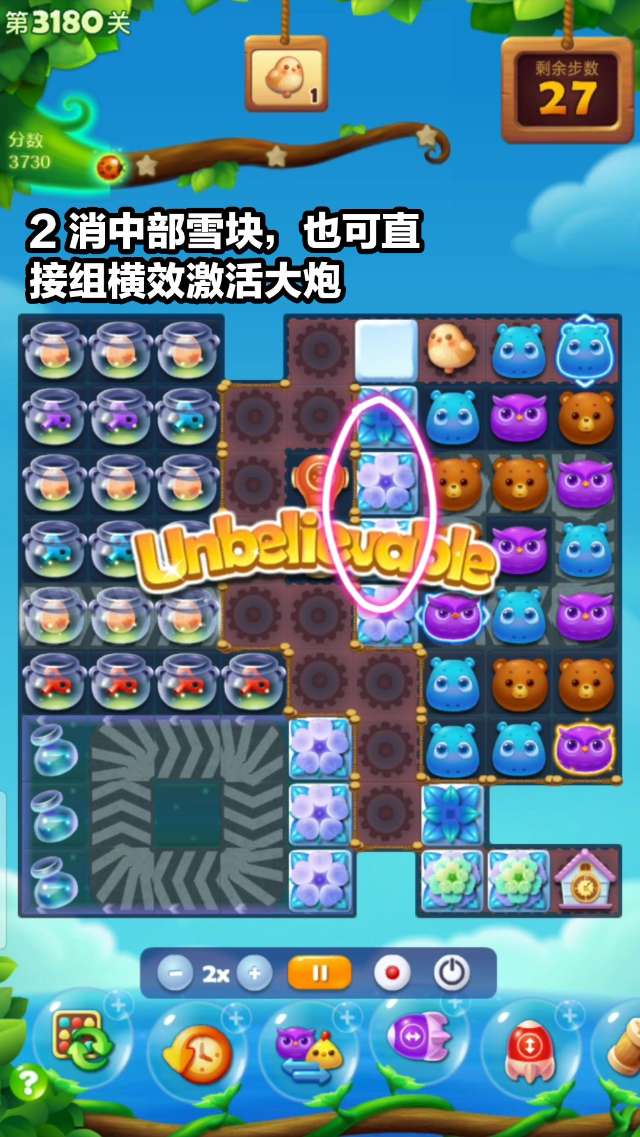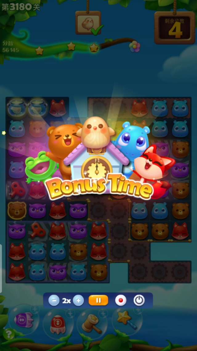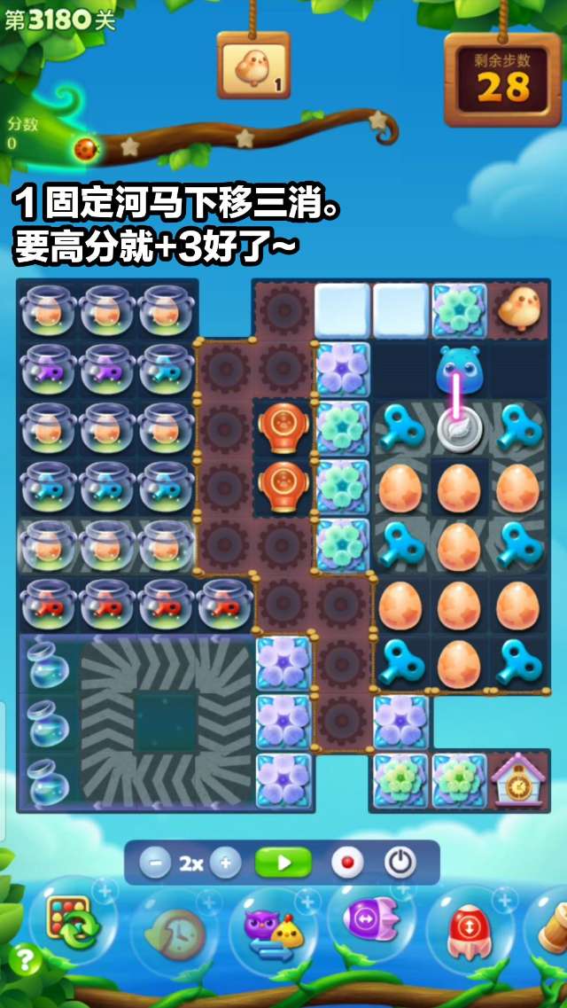 要点:同色发条与小动物互相三消/组特效,助力布谷鸟前行,注意不是在发条周围清除是自身清除就ok。特效爆开,动物流动,容易产生连消,发条自动收集!