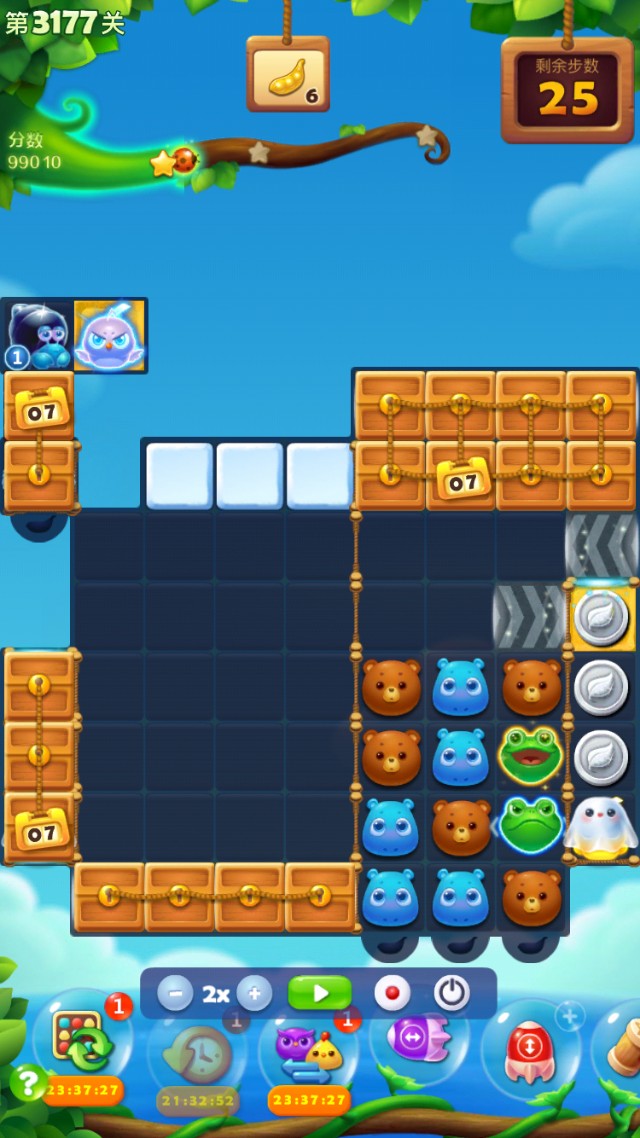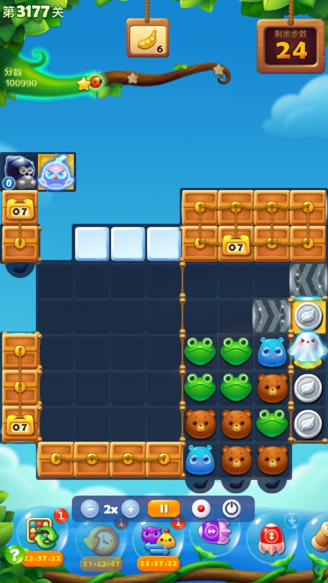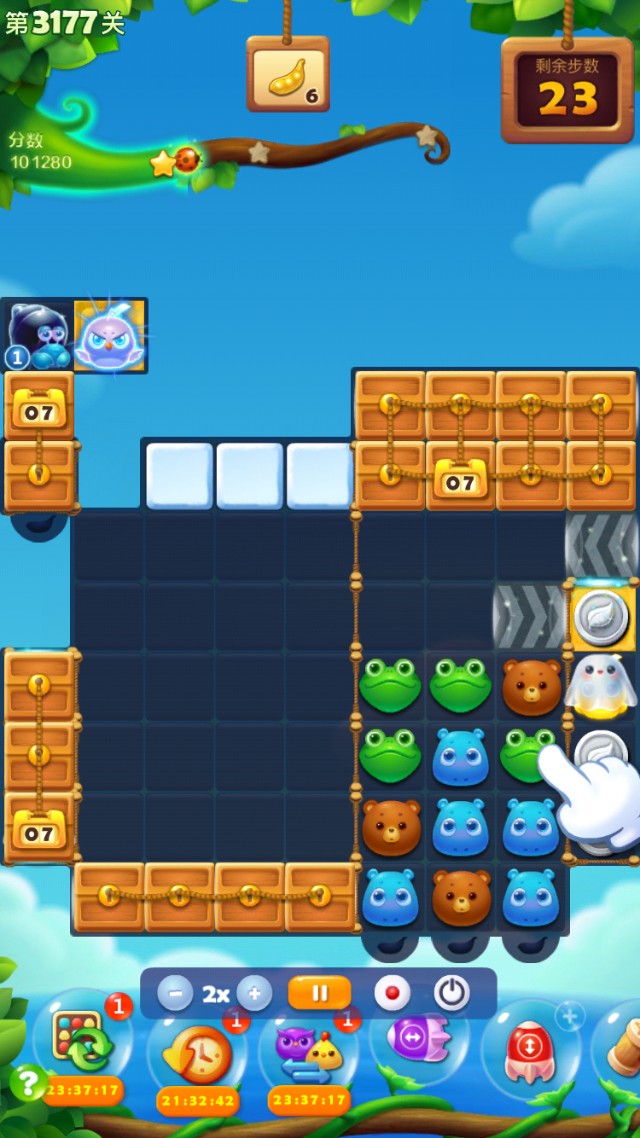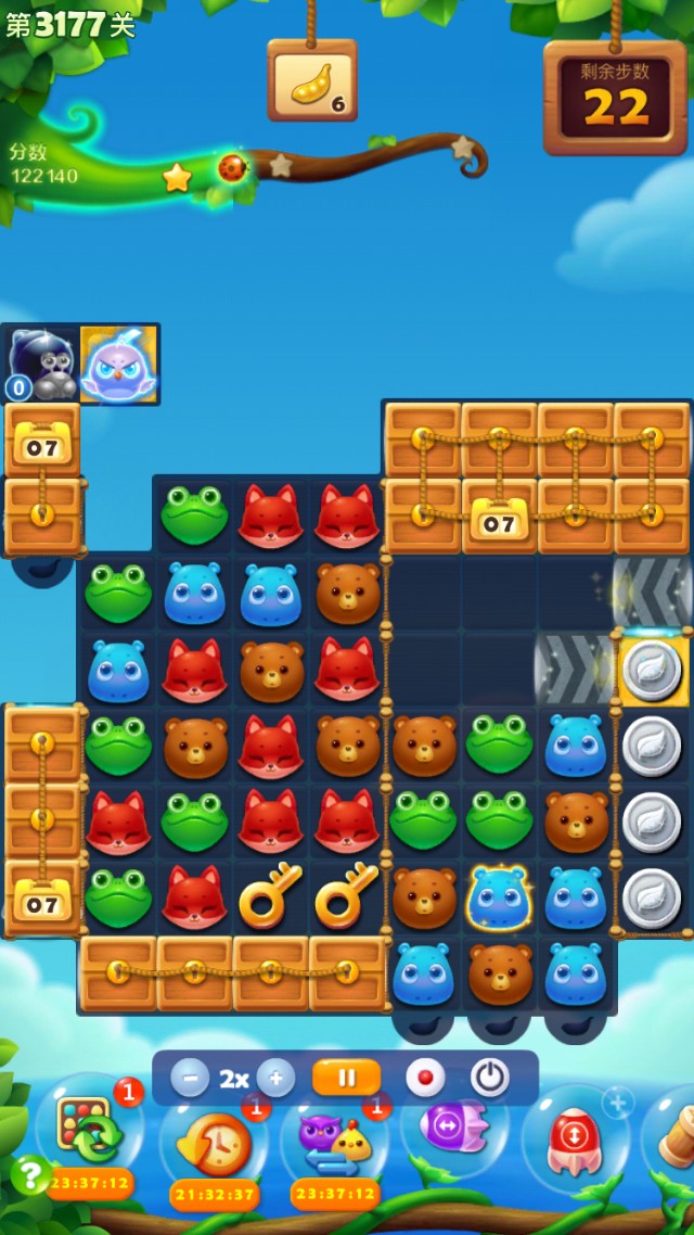 固定开局,右下角攻击幽灵,送幽灵到顶,闪电鸟激活,消除中间上层雪层,让动物掉落,收集钥匙,解锁箱子区域,最左侧下方送幽灵到顶,闪电激活,花团走,快速收集豆荚,不过这种机率比较少,多数都是中间快速向下,然后传送带到右侧,收集豆荚,步数不多,烂尾严重,放弃了,抵押回来,竟然过了,祝福好运!