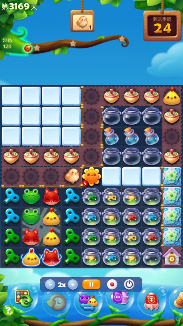 这关就是围绕各种钥匙进行,送小鸟到鸟窝,固定开局,四消收集一轮钥匙,让小鸟动起来的魔法药水掉落,收集钥匙送小鸟前进一步,收集魔法药水,为右下角的魔法瓶充能,打破魔法瓶,露出药水,注意右侧冰层能先消除最好消除,步数不多,烂尾严重,上分难,三星不易,补星成功,祝福好运!