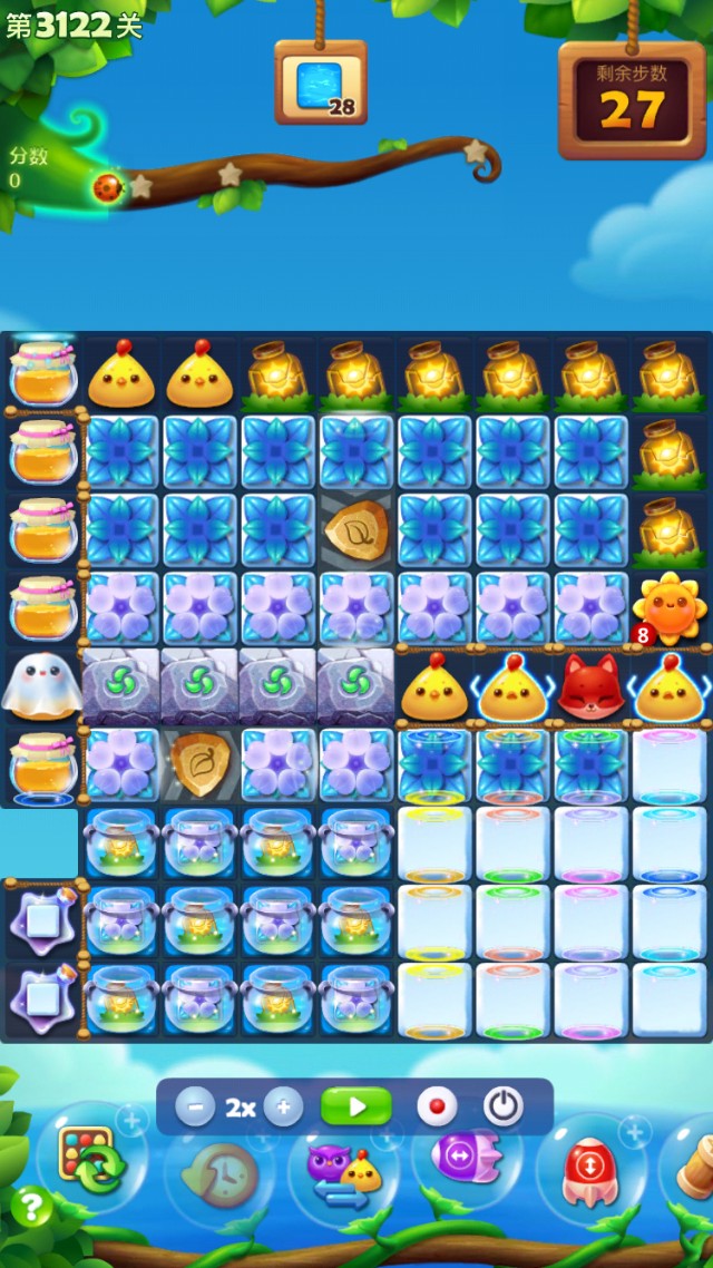 固定开局,中间三消,怪到顶,激活太阳瓶,释放太阳花,激活两个魔法石,利用魔法石打开左侧中间石板,露出魔法药水,收集魔法药水,为下方魔法瓶充能,利用魔法石打破魔法瓶,攻击太阳瓶时,收集左右的雪块,点亮左下角的星星瓶,交换,右下角的蜂蜜罐,激活,移动位置,收集荷塘,步数不多,烂尾严重,过关不易,祝福好运!