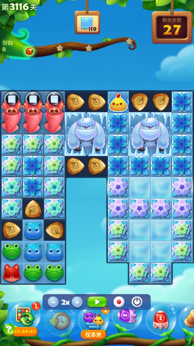 固定开局,左下角激活魔法石,向上消除冰层,收集雪块,送左上方章鱼回家,激活中间雪怪附近的魔法石,利用魔法石送雪怪回家,让动物充满右侧,然后右上方多组竖直特效,全力向下消除冰层,雪层,收集冰块,步数不多,烂尾严重,需要积攒运气,祝福好运!