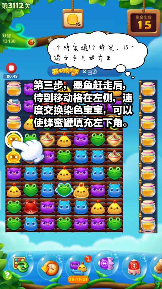本关主要就是注意前期利用连消或者特效组合清理陀螺快一点,后期利用组特效清理蜂蜜罐。