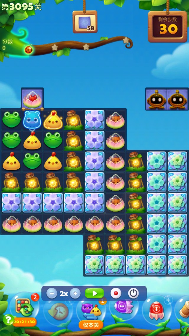 开局特效,走几步后双鸟炸屏,随后多在右下脚组特效,先攻到最底层,尤其注意最右边一列雪块,跳豆留在药屏收完再换,留言曾好运,加油!