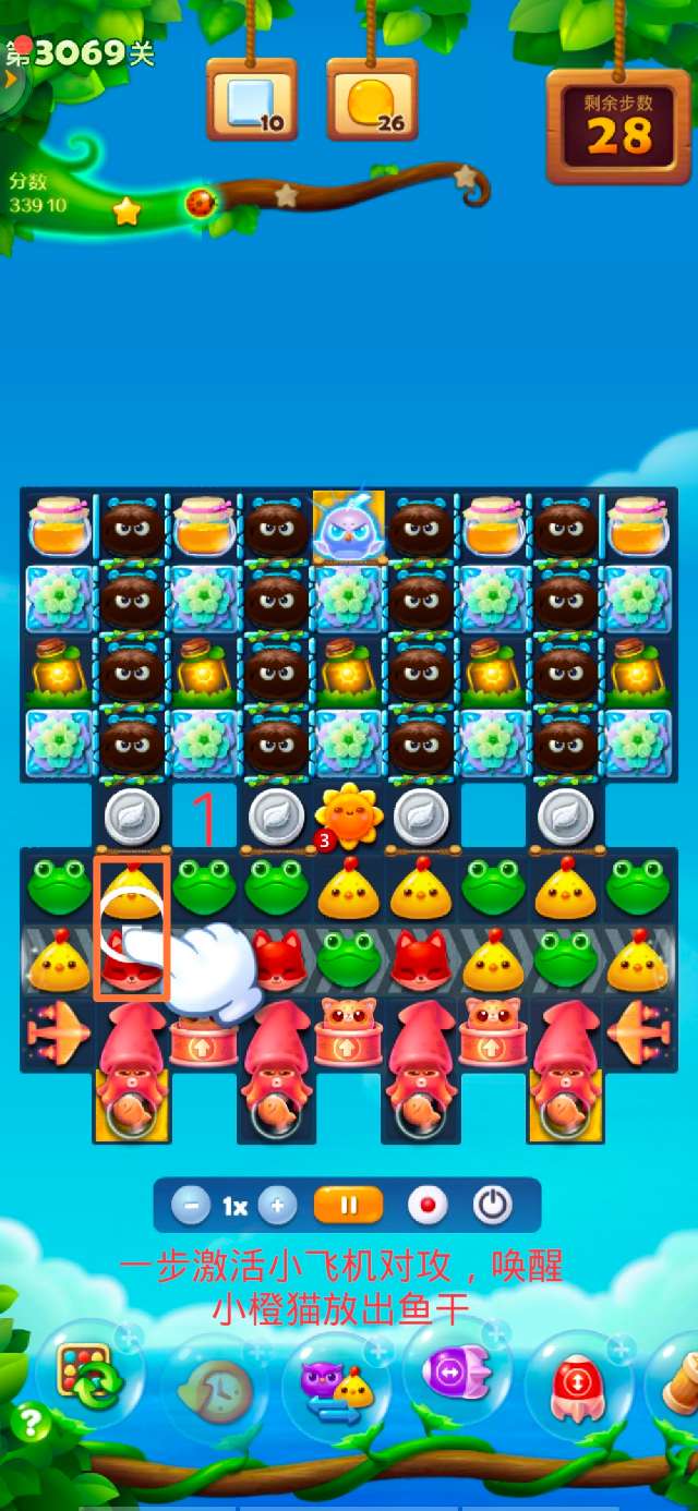 1.一步激活小飞机对攻,唤醒小橙猫放出鱼干;