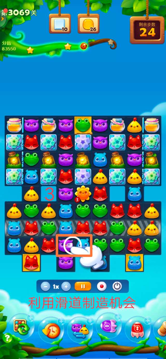 3.利用滑道制造机会,削冰的同时收阳光瓶,引爆太阳花破罐出蜂蜜;