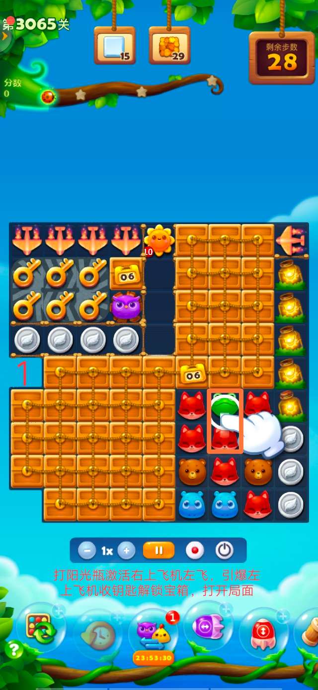 1.打爆右侧阳光瓶,激活右上飞机左飞,引爆左上飞机收钥匙解锁宝箱,打开局面;