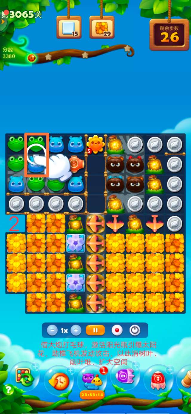 2.借左上大炮右打毛球,激活阳光瓶引爆太阳花,助推飞机发动攻击,消除树叶、削薄叶堆,扩大空间;