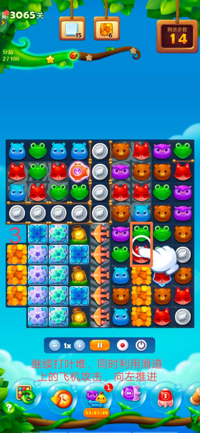 3.继续打叶堆,同时利用滑道上的飞机向左推进;