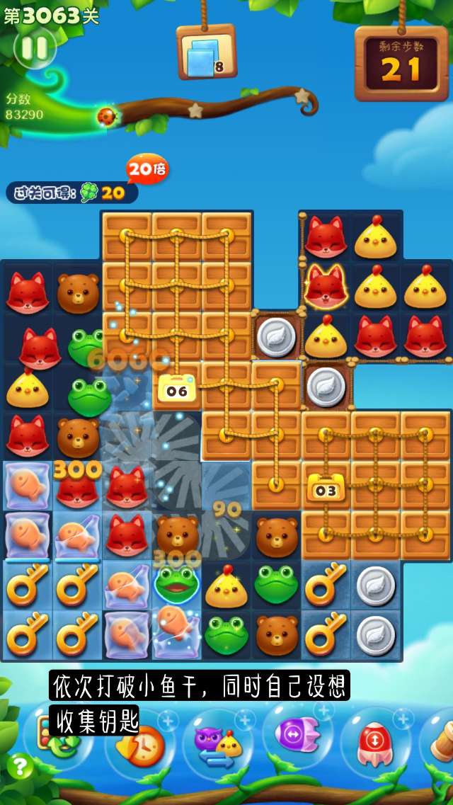 【连续消除】:连续消除得分:一般消除一下30分,连消每次+30,60、90、120依次叠加;冰块里面消除一次1000,连消一次+1000,2000、3000、4000依次叠加;5+4组合一下给2000,每个被变化动物200分,每打掉一个普通的动物15分,冰块1500。
