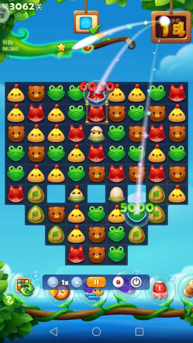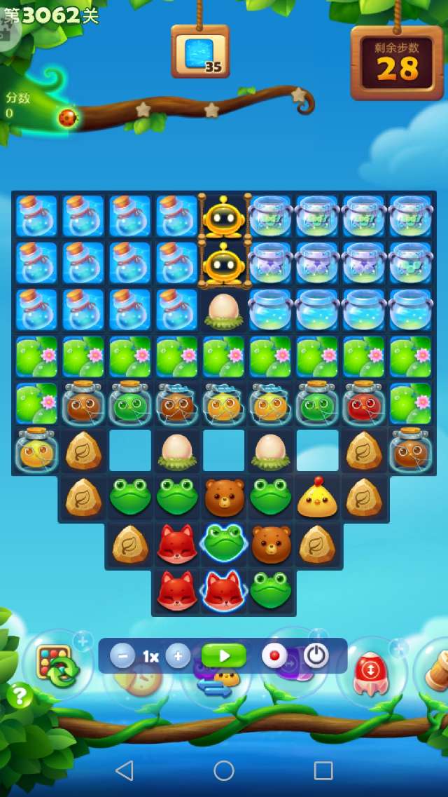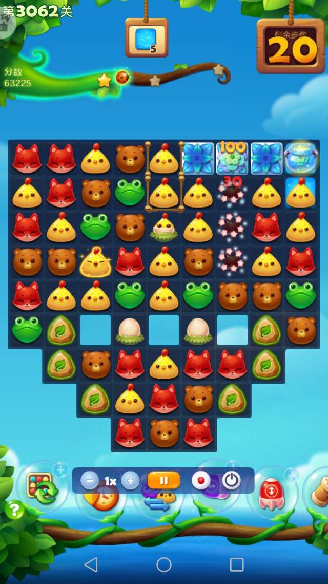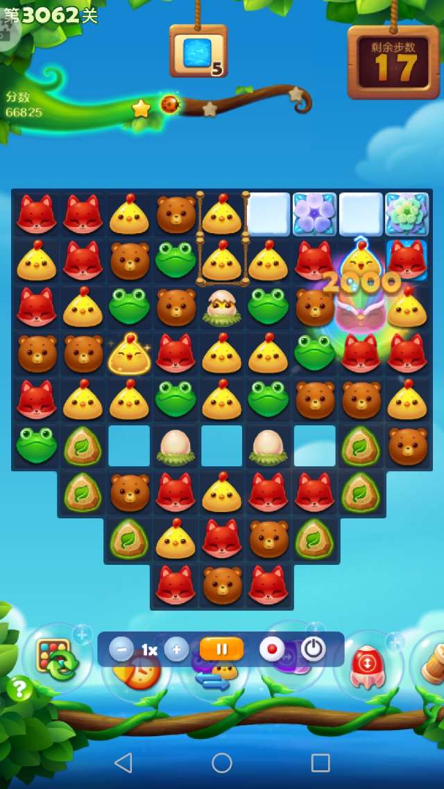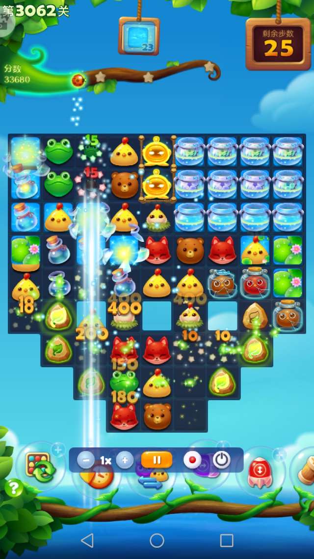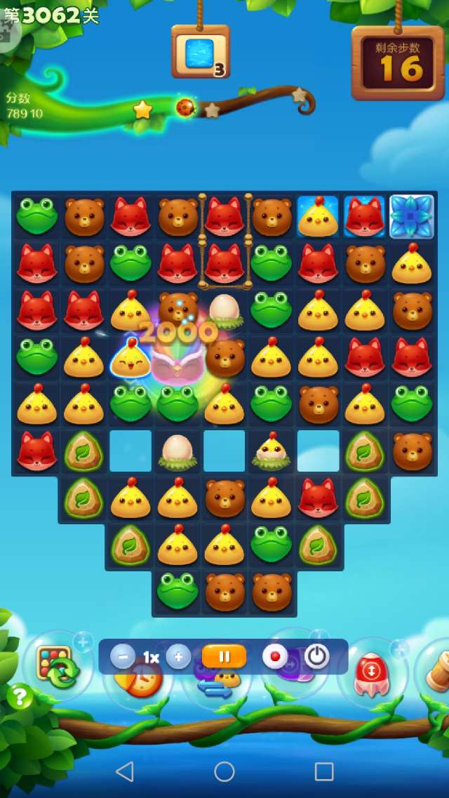 本关前置+3,余16步获得彩星。开局激活魔法石之后,消除萌豆,顺便收集药水并消除鸡窝释放小鸡。3步之后,没有三消而且染色宝宝已点亮,此时只能交换染色宝宝。染色宝宝交换之后,药水很快收集,魔法罐点亮。接下来借助魔法石消除魔法罐和雪块,一路顺风顺水。出现两个鸟+特效,很快过关。