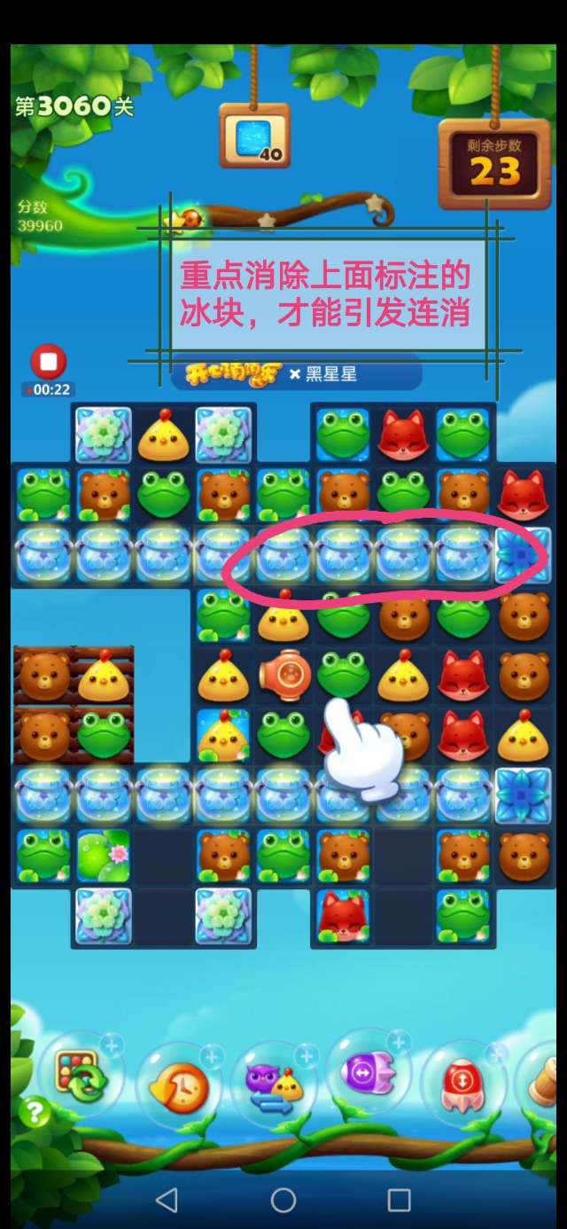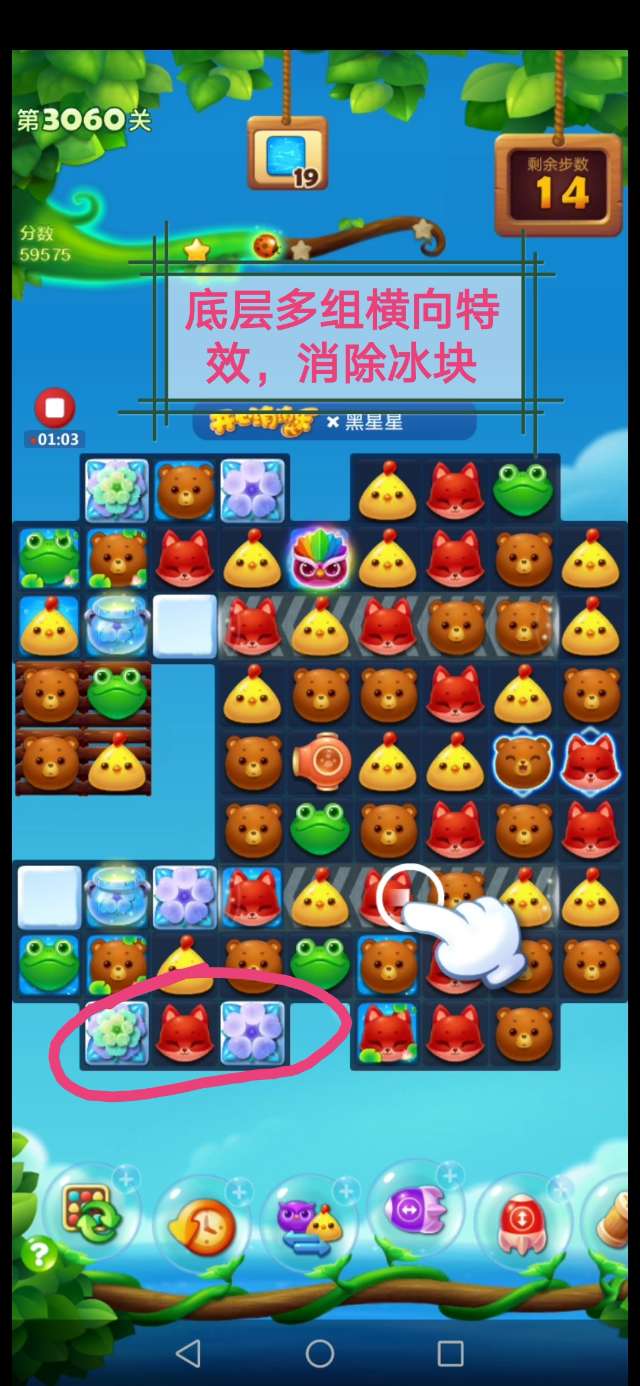 2.中期难点,消除上下两排冰块,优先消除上排,才能引发连消,下排才能好消除