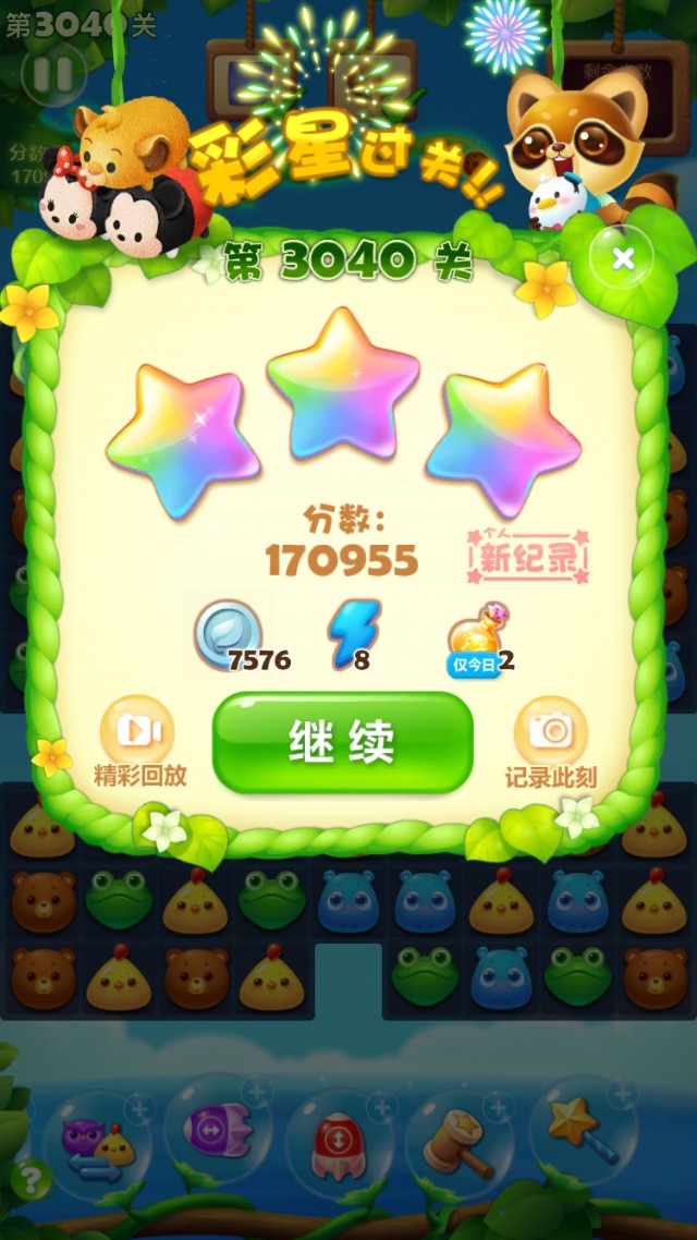 【连续消除】:连续消除得分:一般消除一下30分,连消每次+30,60、90、120依次叠加;冰块里面消除一次1000,连消一次+1000,2000、3000、4000依次叠加;5+4组合一下给2000,每个被变化动物200分,每打掉一个普通的动物15分,冰块1500。