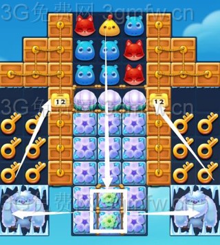 ①上方区域三消消除贝壳,利用水母宝宝继续三消消除下方的雪块,当下方出现两个横向特效后交换救出雪怪,收集钥匙开启宝箱