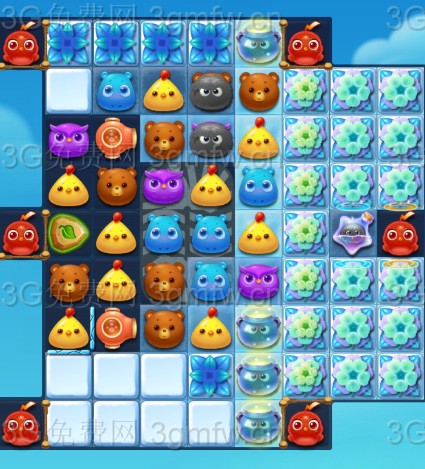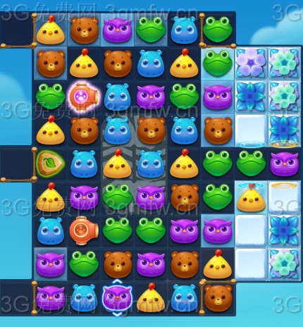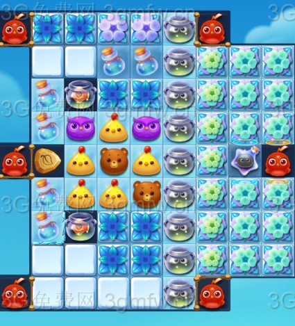 ②中间区域:三消激活炮台,消除毛球,点亮右侧的星星瓶之后交换闪电鸟,六只闪电鸟联动消除中间部分雪块。