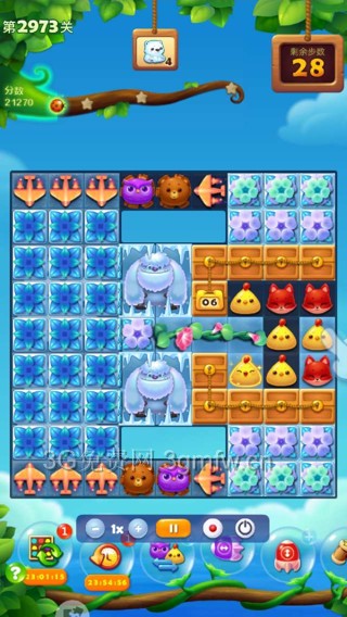 2、需要特效炸开雪怪,向右推进,组乌和特效交换方可大面积消冰,否则过关很难。
