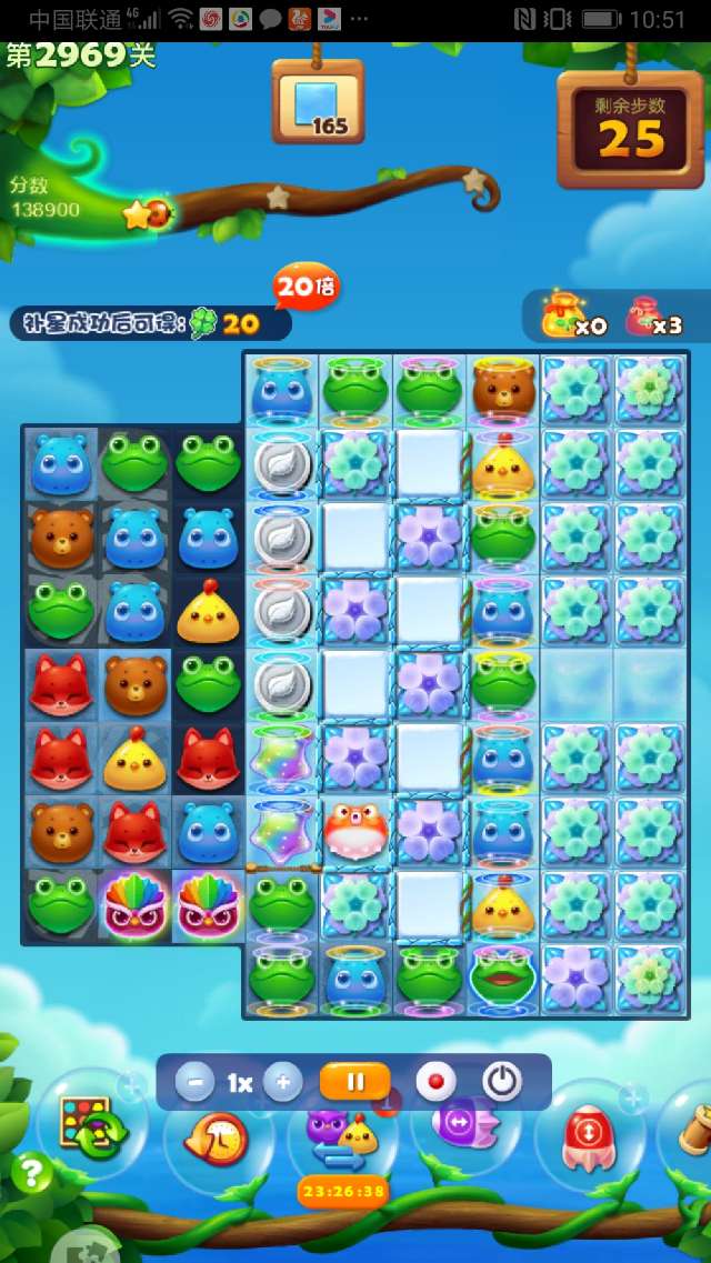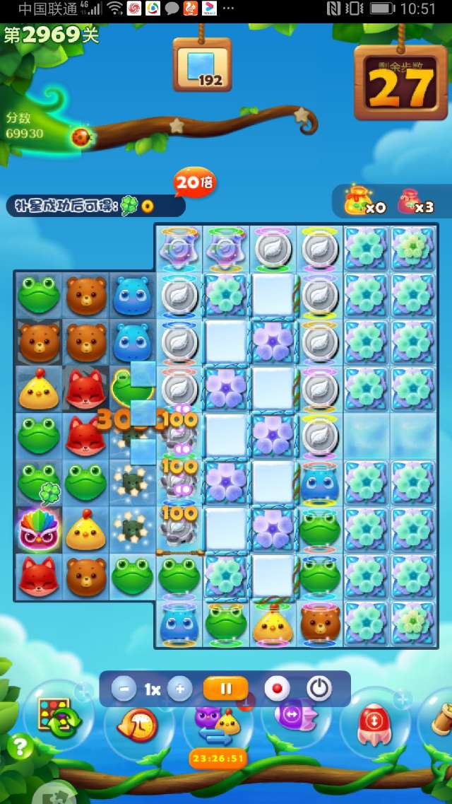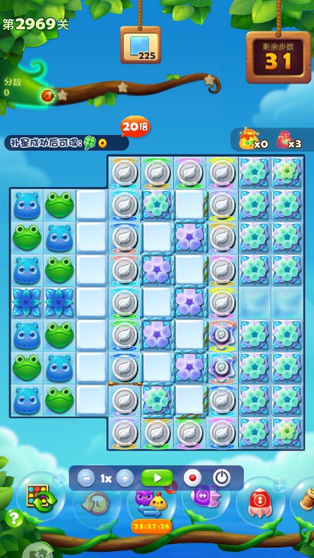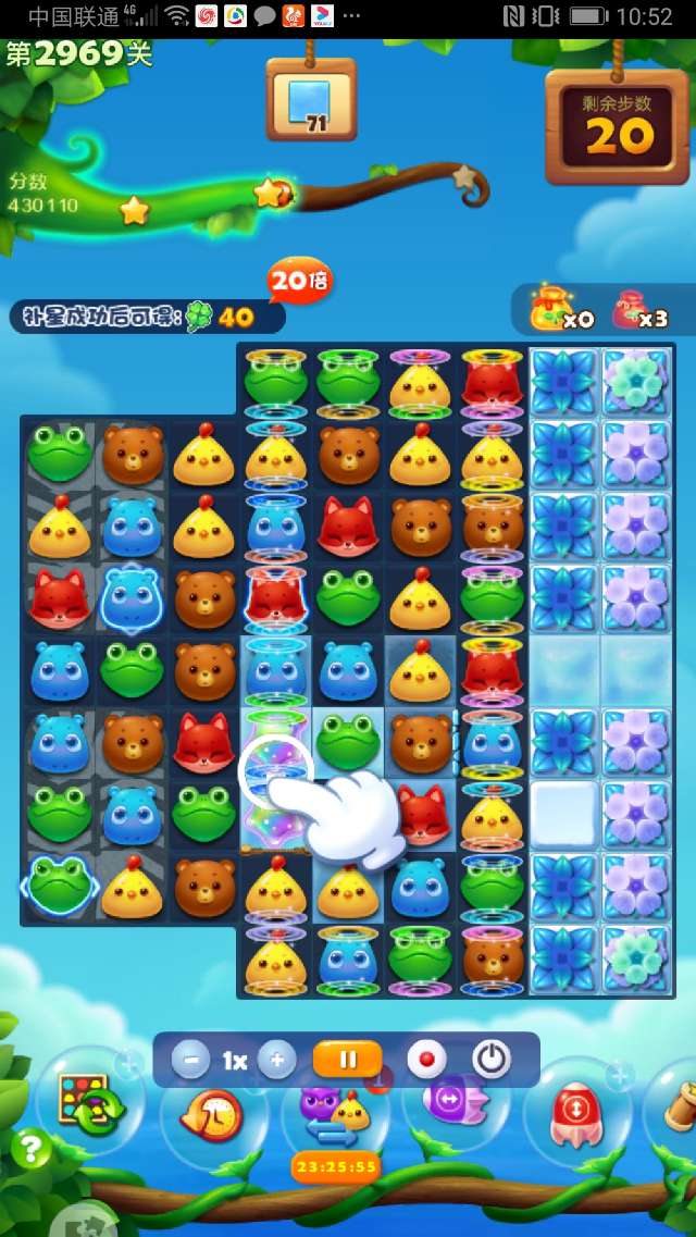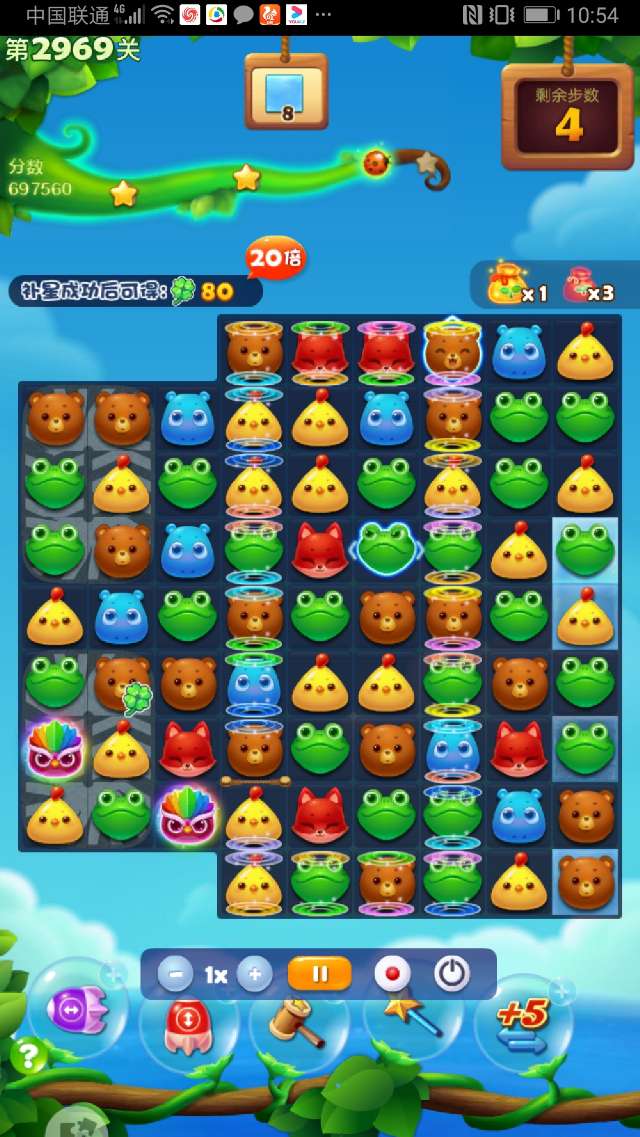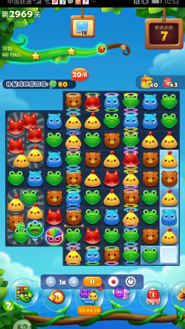 这关确实很难,多次试攻不下,简单的3消不可能完成任务。现在的关卡都需组特效、组鸟十特效、组鸟鸟结合才有可能,幸运降临,组了2次双鸡魔力鸟清屏加双瓶清屏,通过3次大清屏才幸运过关。