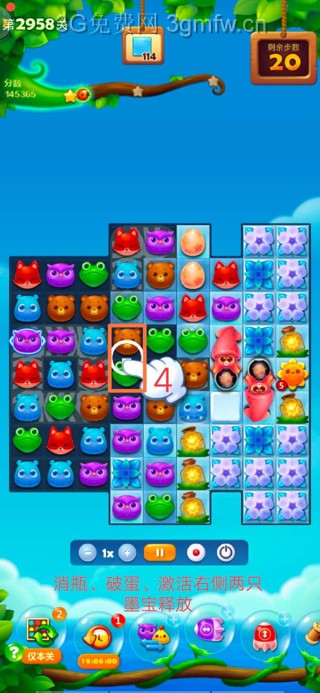 3.打阳光瓶破冰,同时继续消除染色蛋,激活右侧两只墨宝释放;