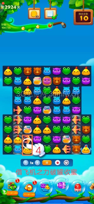 2.借飞机之力消除下部两侧冰块后,激活墨宝释放,蜜蜂罐掉落;