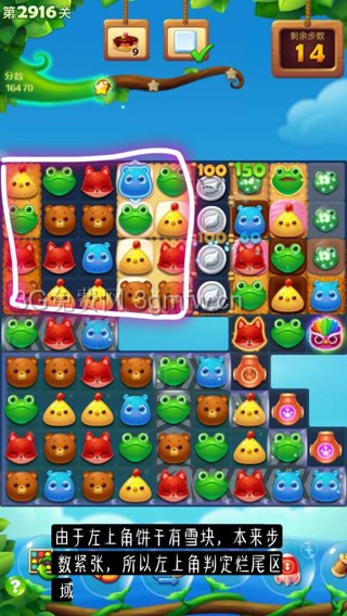 难点解析:由于左上角饼干有雪块,本来步数紧张,所以左上角判定烂尾区域