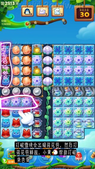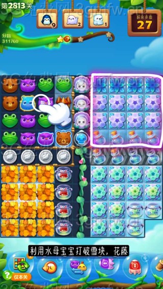 固定左下角开局,消除冰层,露出荷花苞,打开荷花苞,飞出动物消除鸡蛋,树叶飞,然后激活太阳瓶,贝壳激活,利用贝壳消除右上方冰层,收集魔法药水,蔓藤激活,牵牛花开,打破魔法瓶,攻击右下角冰层,冰层太厚,步数不足,烂尾严重,过关不易,三星更难,祝福好运
