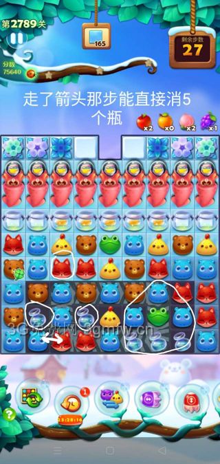 3、瓶子消完出蜜罐,怼着蜜罐打,不用管蜂蜜,蜜罐附近没得消就下面组一下竖向特效和彩鸟,