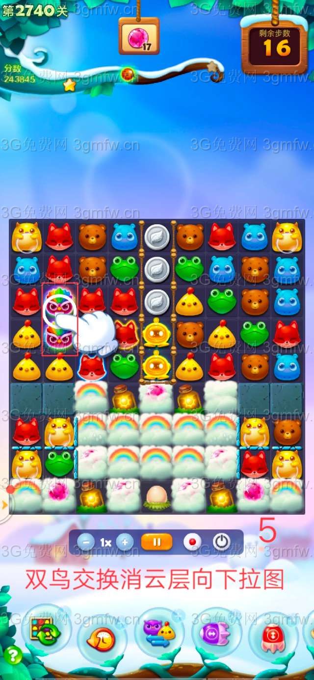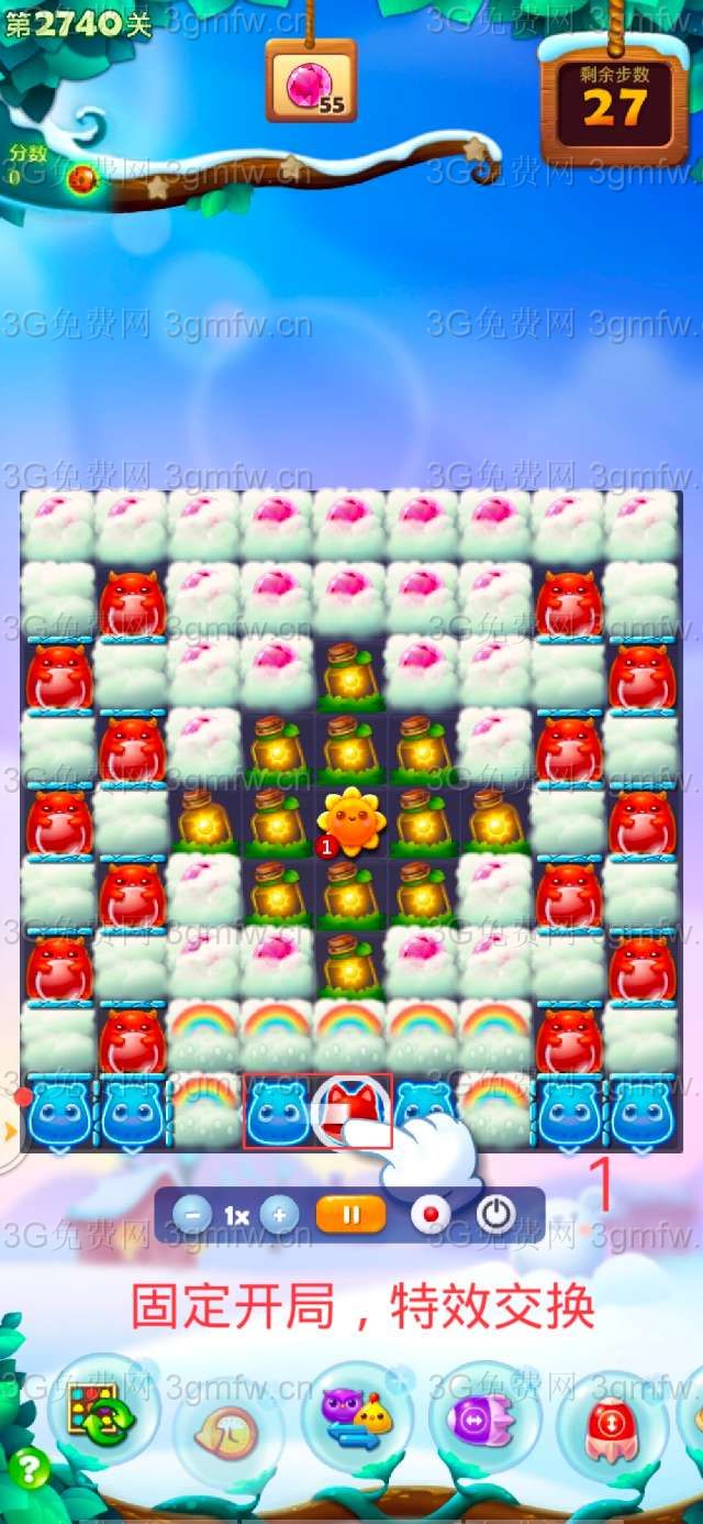 1.固定开局,特效交换,蓄电精灵释放,消除左右两侧云层,动物填充其间;