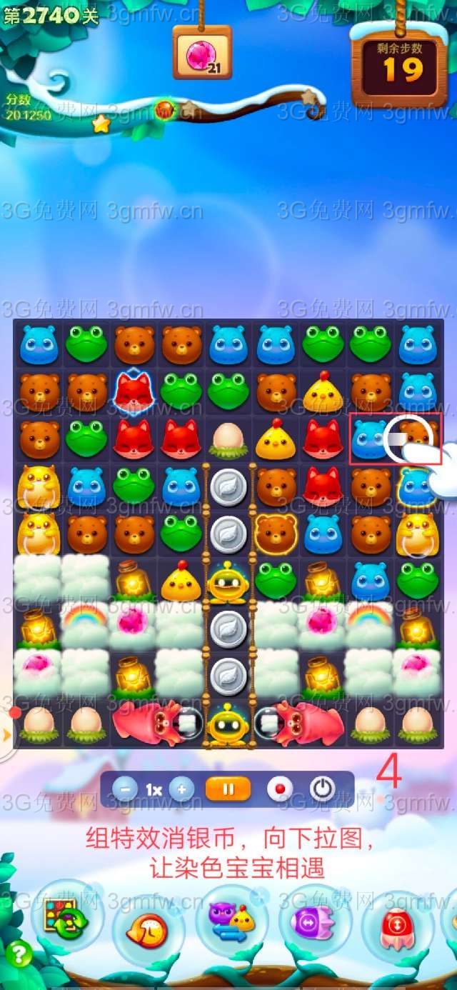3.打鸡窝出小黄鸡喂饱蓄电精灵,同时消除银币,让两个染色宝宝相遇并激活;