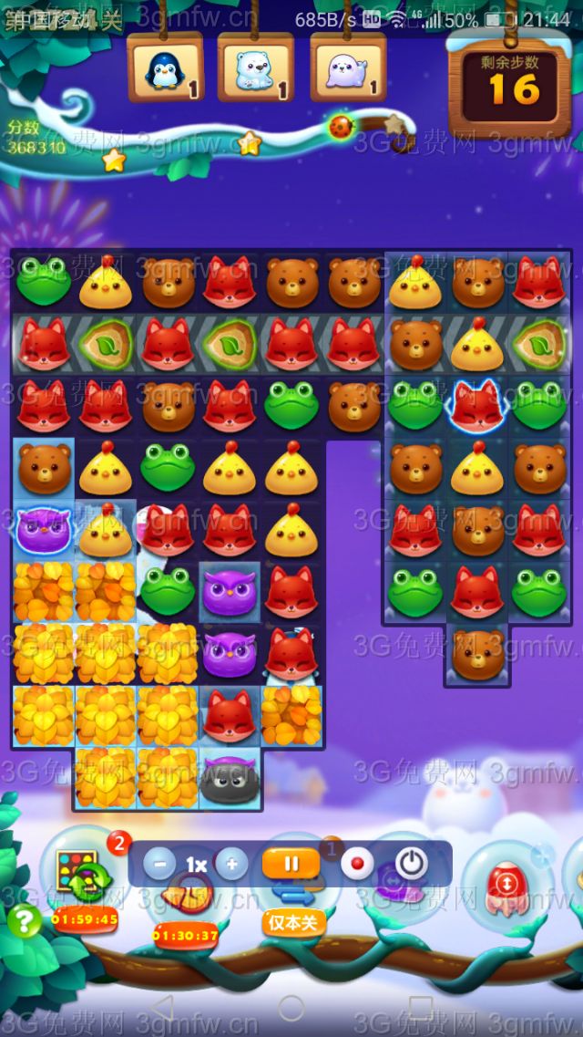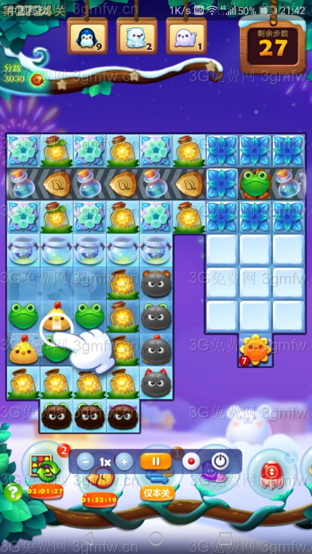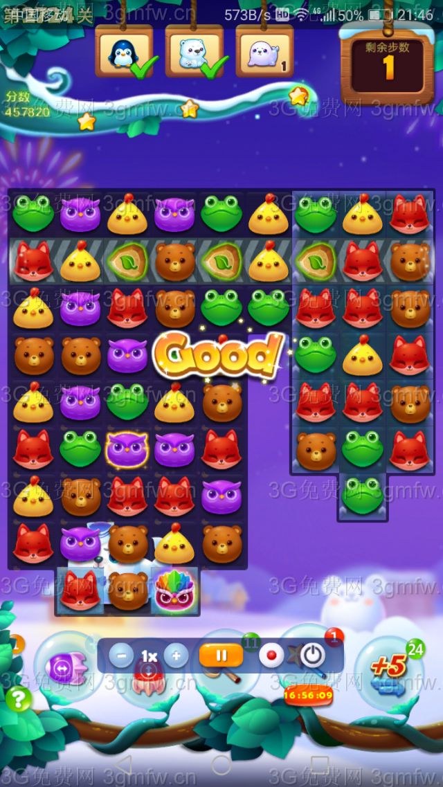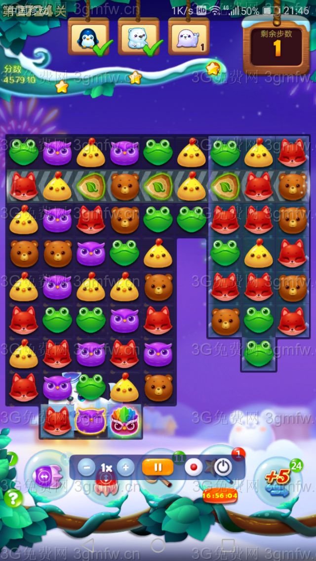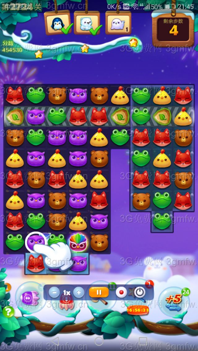 余一步时用强制交换消小熊使爆炸特效下落到魔力鸟旁边,然后魔力鸟交换爆炸特效过关。