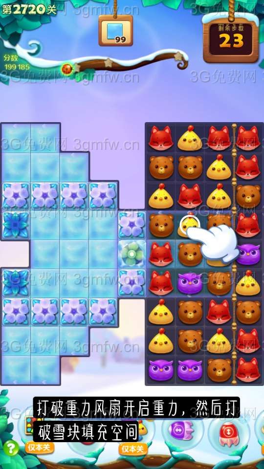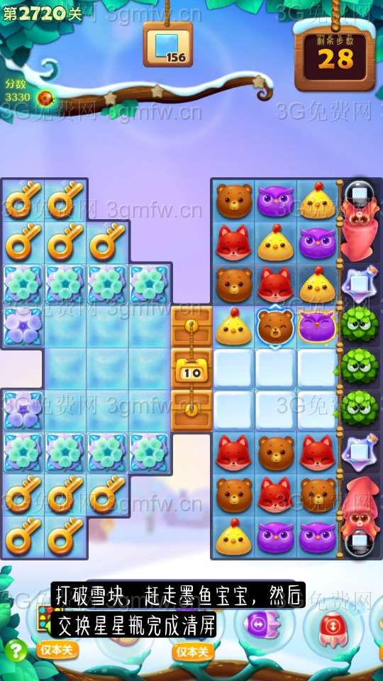 固定开局,左上角,两次三消,消除冰块,右下角三消冰块,点亮星星瓶,交换,收集钥匙,解锁箱子区域,然后激活风扇,动物充满左侧区间,打开左侧上下通道,让动物上下充满,上下两个角烂尾非常严重,很难消除,这关如果有可能多组竖直特效,全面消除,祝福好运。