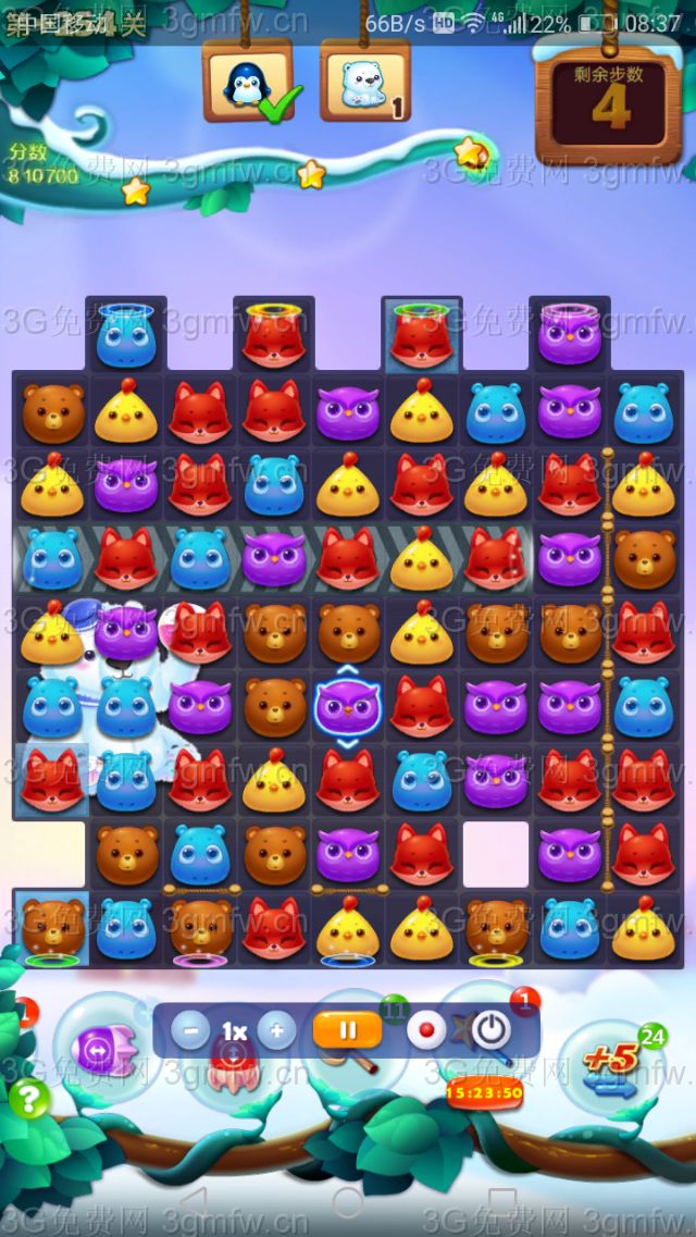 右下角消狐狸开局,先在上方组竖向特效和打气鼓鱼把下边打开缺口,然后在下边组横向特效消冰块解救动物。
