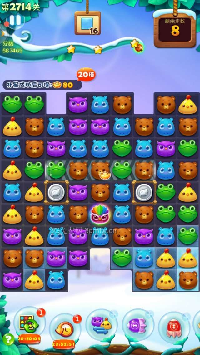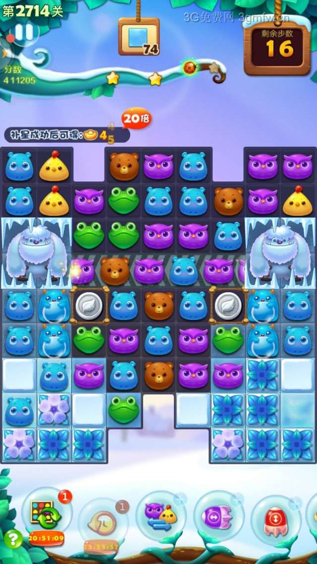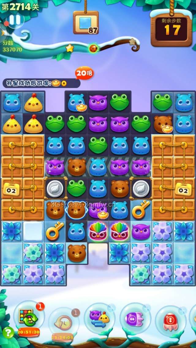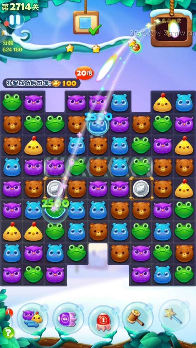 开心消消乐2714关卡补多3颗星星。开始买+3步,个人建议最好准备一根魔术棒,周塞关卡有免费赠送。开始移动一步消除雪块,蓄电精灵吞噬同颜色小动物后,两只大雪熊释放出来,跳动震碎或减薄雪块。要消除完钥匙,还有两只大雪熊。这时,想办法组一次双魔力鸟,如果钥匙剩下两把,清屏消除雪块时,接着又是两只大雪熊跳动。左右下角的雪块,总是有一两块无法消除完,组成魔力鸟,看小动物那只分布在左右下角最多,点魔术棒在魔力鸟旁边,互换后即可消除完雪块。