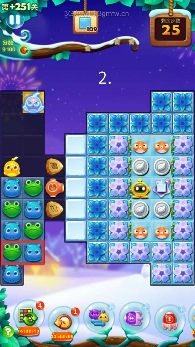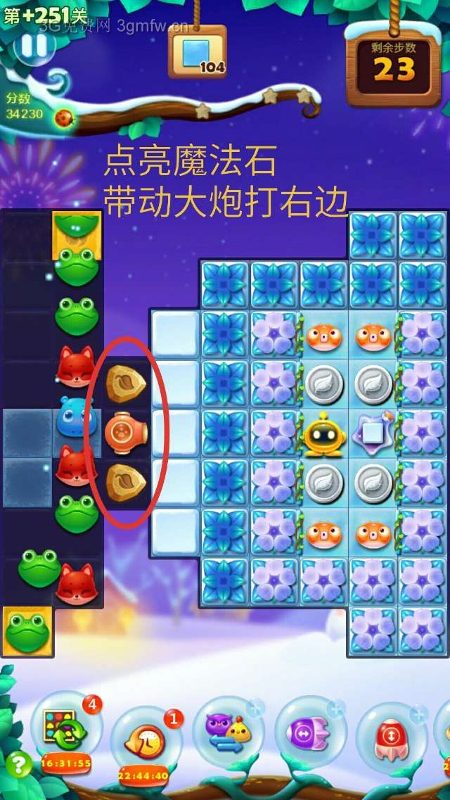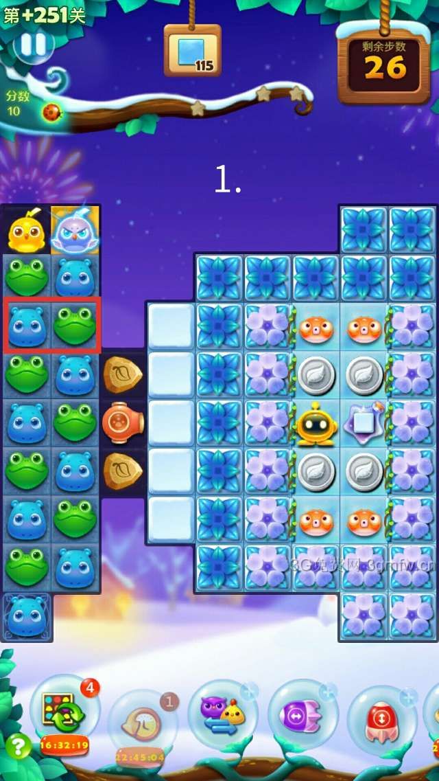 开局左上角动物交换,让闪电宝宝下落,然后左下角动物交换,闪电宝宝在下落,闪电激活,攻击中间魔法石和大炮,开始右侧区域,点亮染色宝宝和星星瓶,两个相遇,交换,消除右侧上下的冰块,冰层比较厚,最上和最下位置刁钻,不太容易消除,烂尾过,祝福好运,加油!新年好