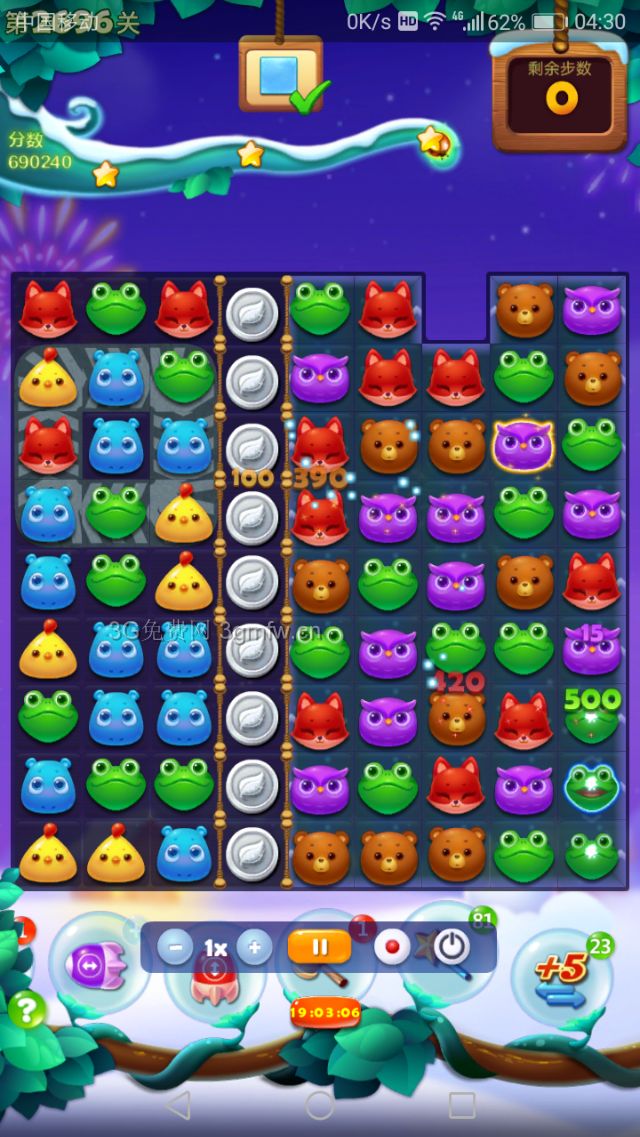 【连续消除】:连续消除得分:一般消除一下30分,连消每次+30,60、90、120依次叠加;冰块里面消除一次1000,连消一次+1000,2000、3000、4000依次叠加;5+4组合一下给2000,每个被变化动物200分,每打掉一个普通的动物15分,冰块1500。