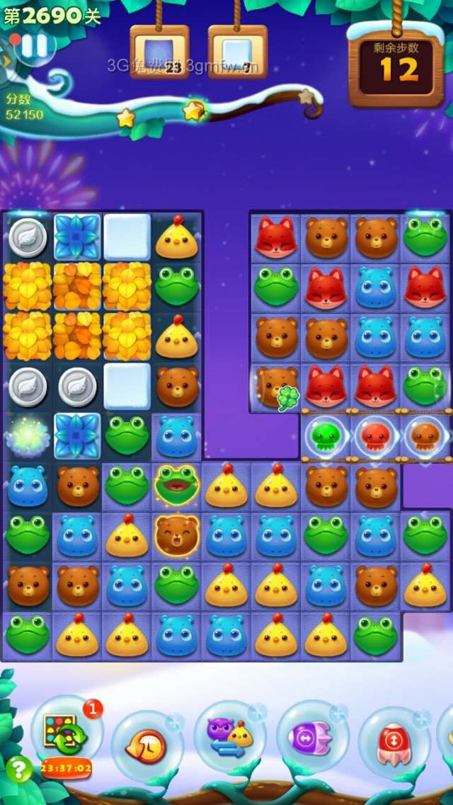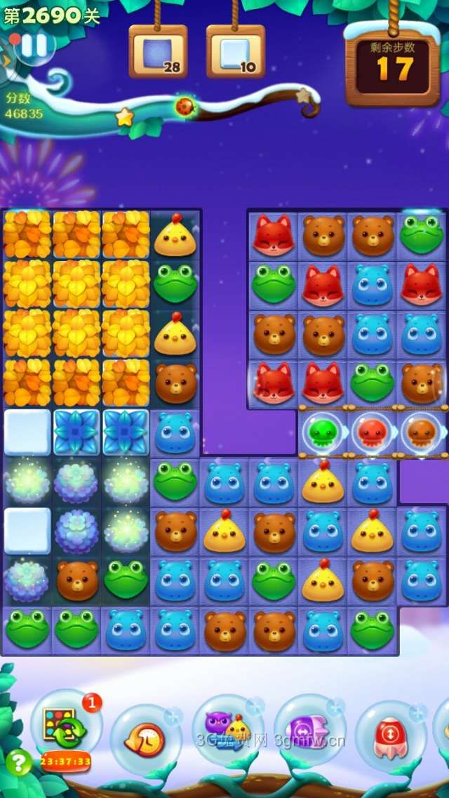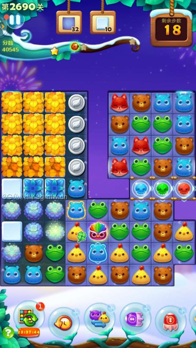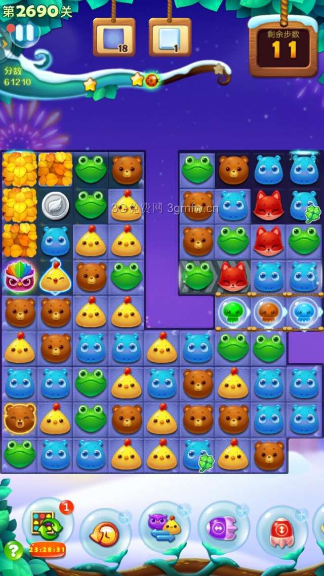 开心消消乐2690关卡裸过关。这关玩了几次,不过关,点了个30分钟无限精力瓶。开始右下角固定打爆一只花团,花团散开,左右上角的一只白幽灵消失。打爆右上角的贝壳出水母,水母特效消除右下角的磁力罐,右下角的小动物或特效往左边移动往左上角,如果在左边中间组成了爆炸特效和爆炸特效,树叶块就容易消除掉了。在左上角组成一次魔力鸟和直线特效互换,蓝染色体差不多染完,移动一两步,染完成蓝布兜过关。