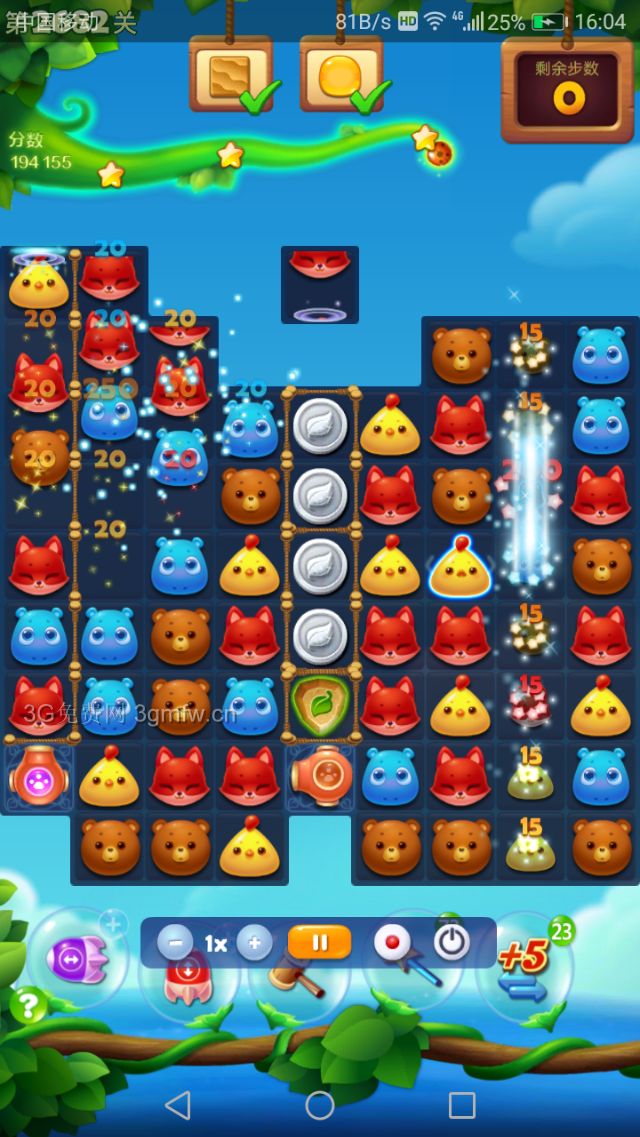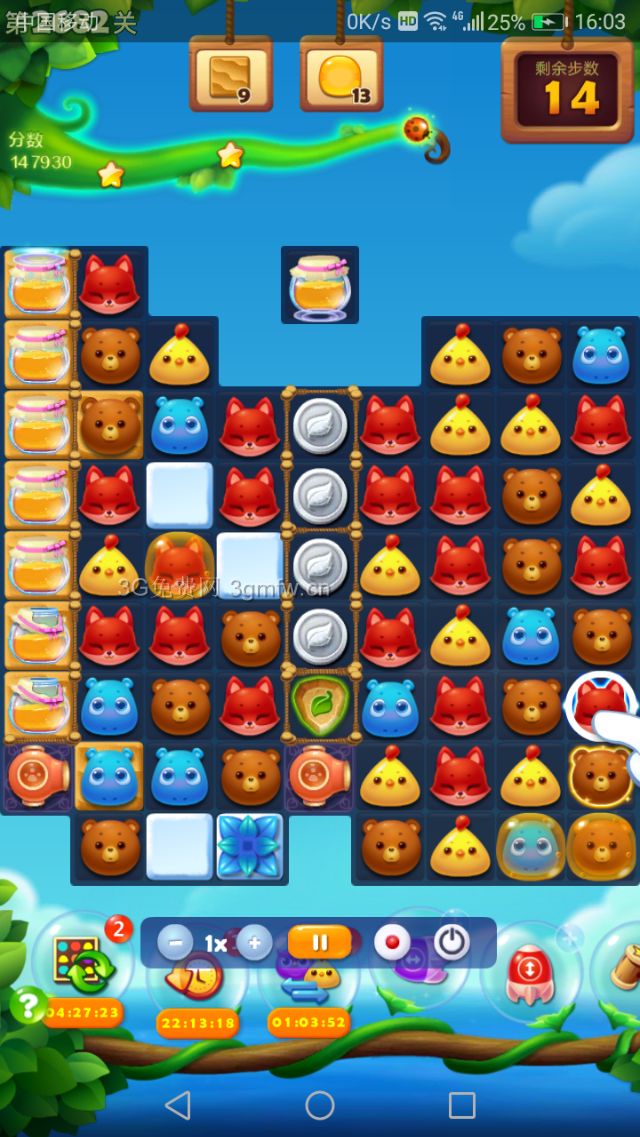 随便交换两个特效开局,消除雪块和流沙点亮星星瓶交换,然后主打魔法石和魔法炮消除蜜罐和流沙。