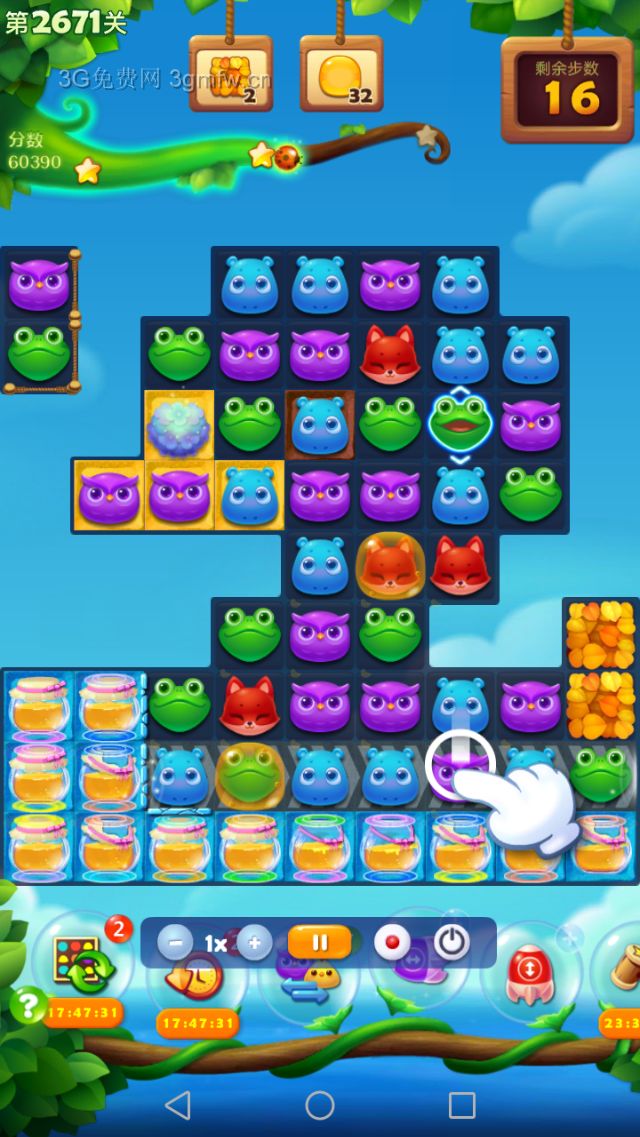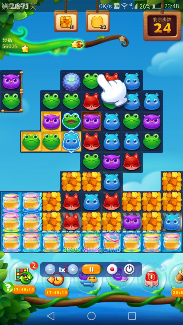 双鸟开局,消除小叶堆后疯狂打蜜罐就可以了,右下方蜜罐不好打注意一下。