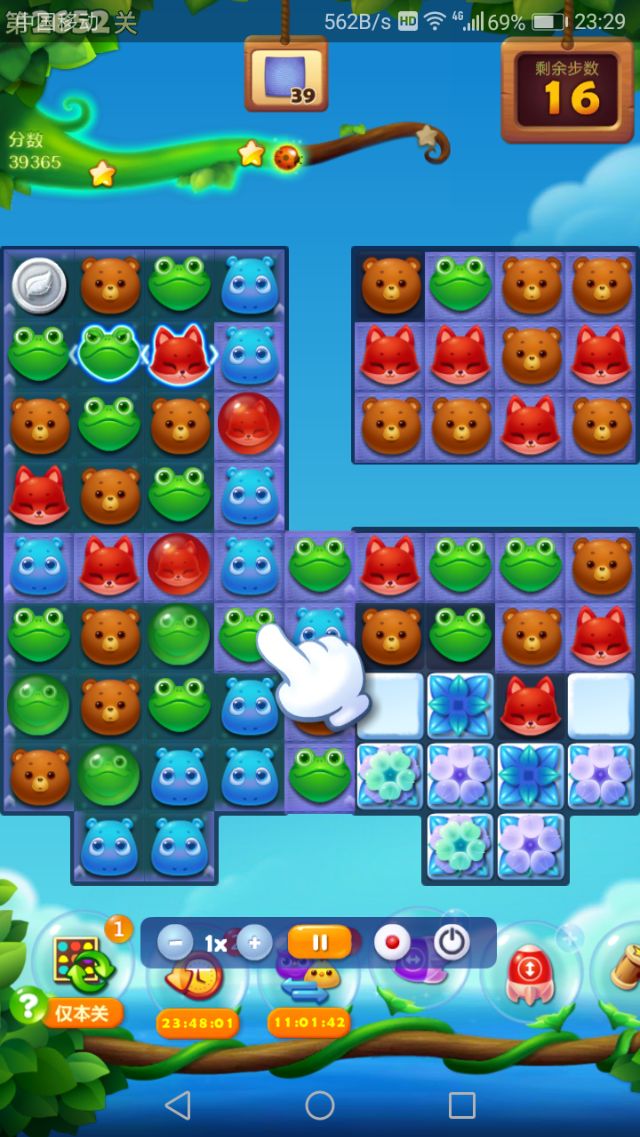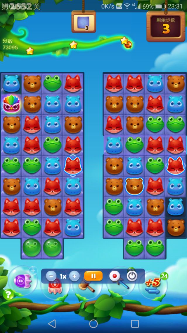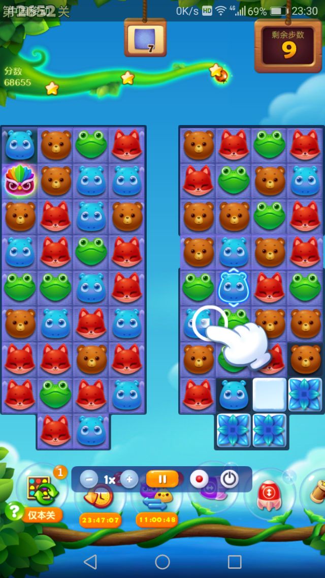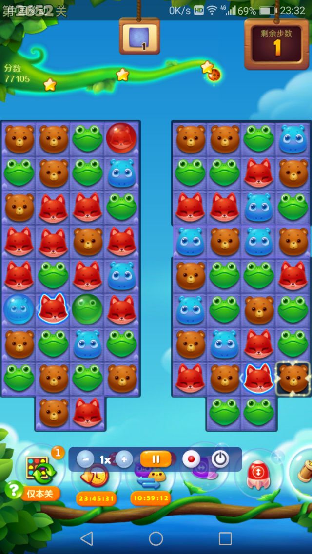 ②左方区域三消收集钥匙,开启宝箱,该区域受重力场影响,小动物从下到上掉落,可翻转手机90度移动消除。