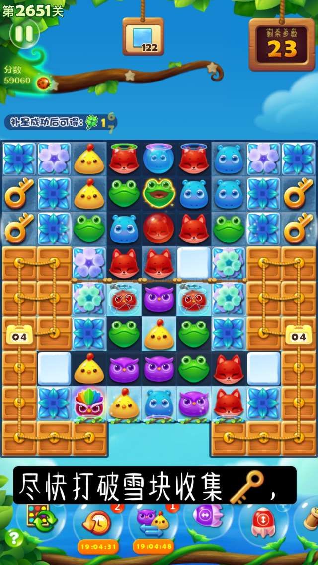 ②上方区域三消消除雪块,向左右两侧扩展,直至收集4枚钥匙,开启剩余的宝箱。