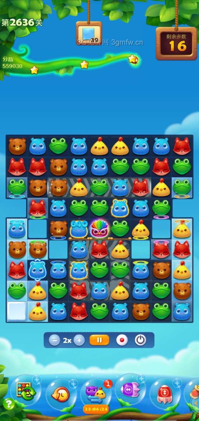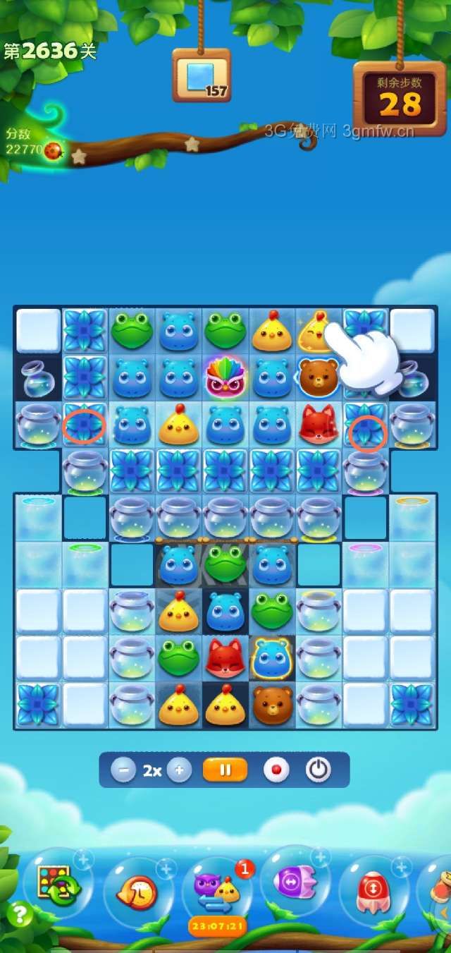 固定开局,激活中间下方的花团,然后露出魔法药水,消除冰块,收集魔法药水,打破魔法瓶,让动物充满左右下方,然后多组特效,消除冰块,左右下方冰层有点厚,位置刁钻,不容易消除,步数不多,容易烂尾,祝福好运。