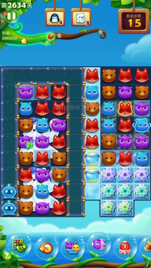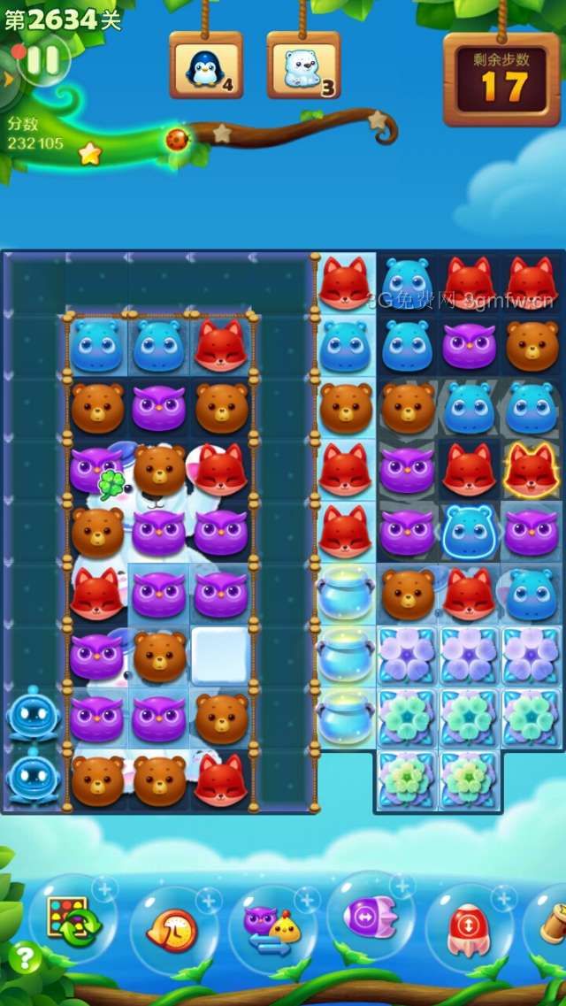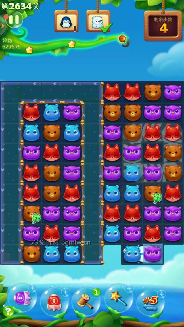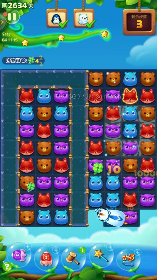 开心消消乐2634关卡买+3步。有乐友说点魔力鸟前置,可单吸蓝河马,试过一次,魔力鸟没机会单吸蓝河马。倒是有一次组成魔力鸟,单吸了蓝河马。右上角的蓝色萌豆爆炸后,出现3只药水瓶,消除完药水瓶。旁边白色的罐子,一消除就爆开。右下角底部的雪块厚,尽可能组成爆炸特效和爆炸特效互换,很难组成特效,玩了一个小时无限精力瓶也不过关。因豆荚要留给2639关,不停的玩,等来了运气,过关了。