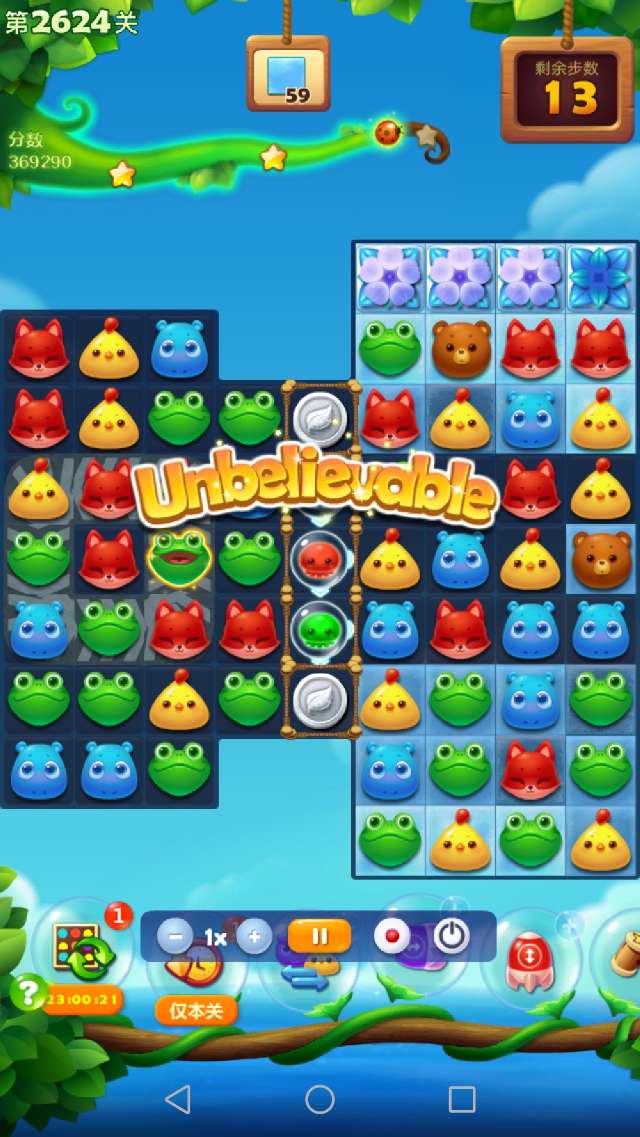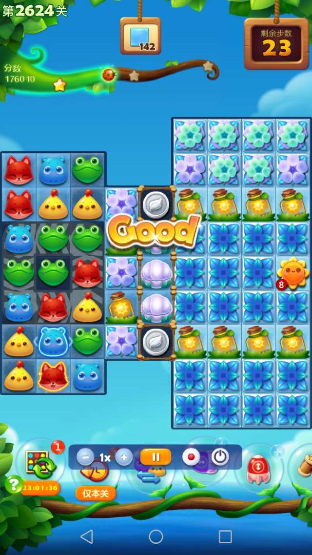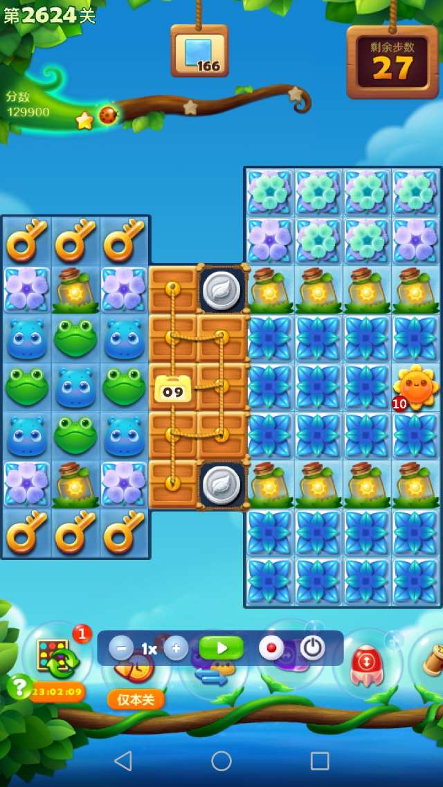 本关押豆荚过后,利用补星瓶和一个后退获得三星。开局打爆左侧阳光瓶收集钥匙,打开宝箱。激活水母同时组织特效将右侧阳光瓶打爆使太阳花清屏一次。然后组织特效消除残余雪块。合成双鸟加速过关的步伐。由于道具所剩不多,关键时候用一后退,成功通过。