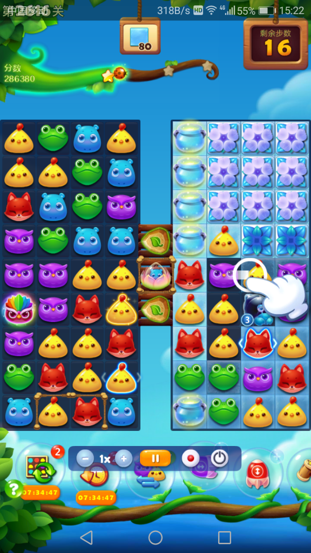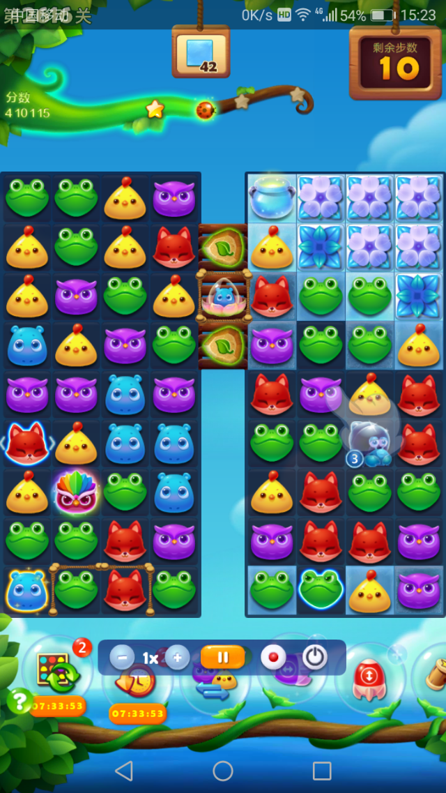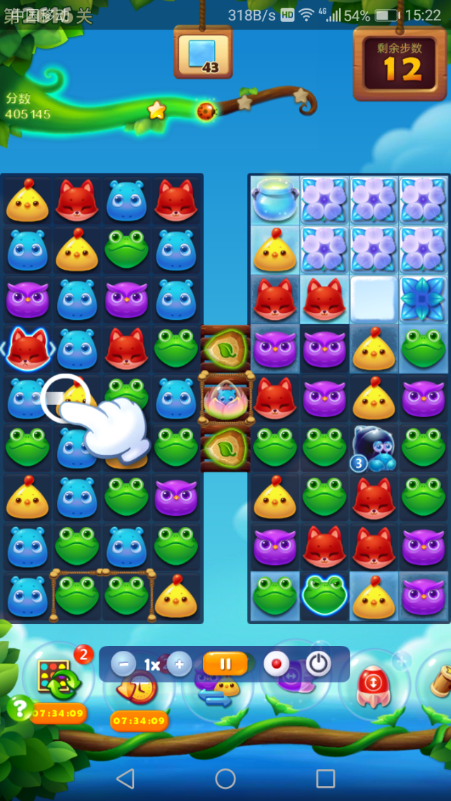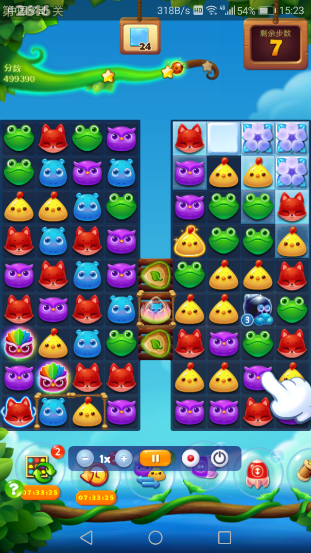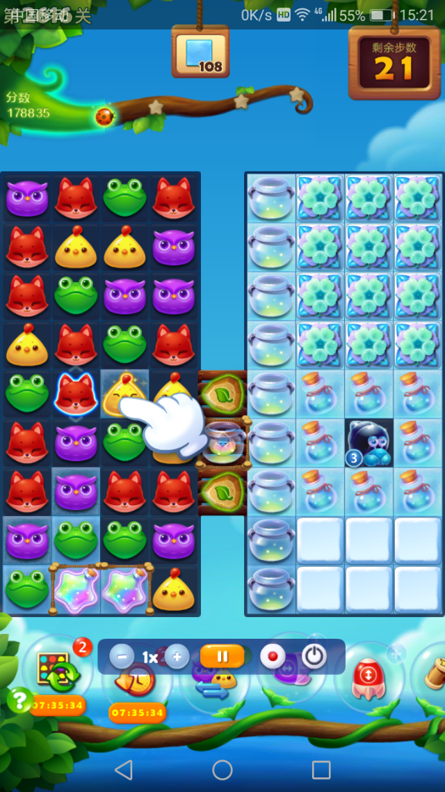 交换两个特效开局,消除雪块和毛球点亮星星瓶交换,然后打掉魔法罐,找机会在右下方组竖向特效,右上方能消除雪块的步子优先走,没有好的步子可走时打一下魔法石消除荷花苞释放河马,极大概率出魔力鸟或特效。