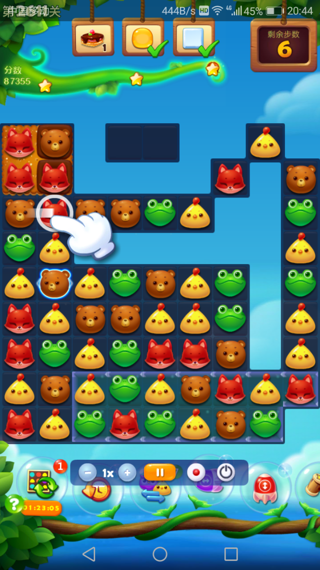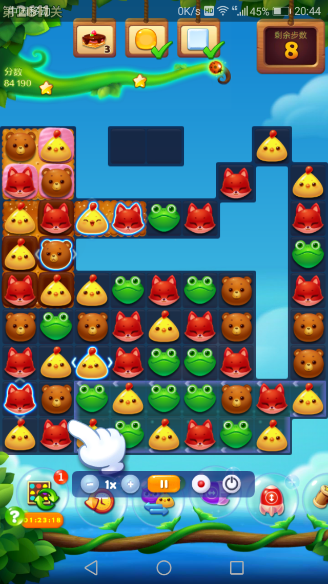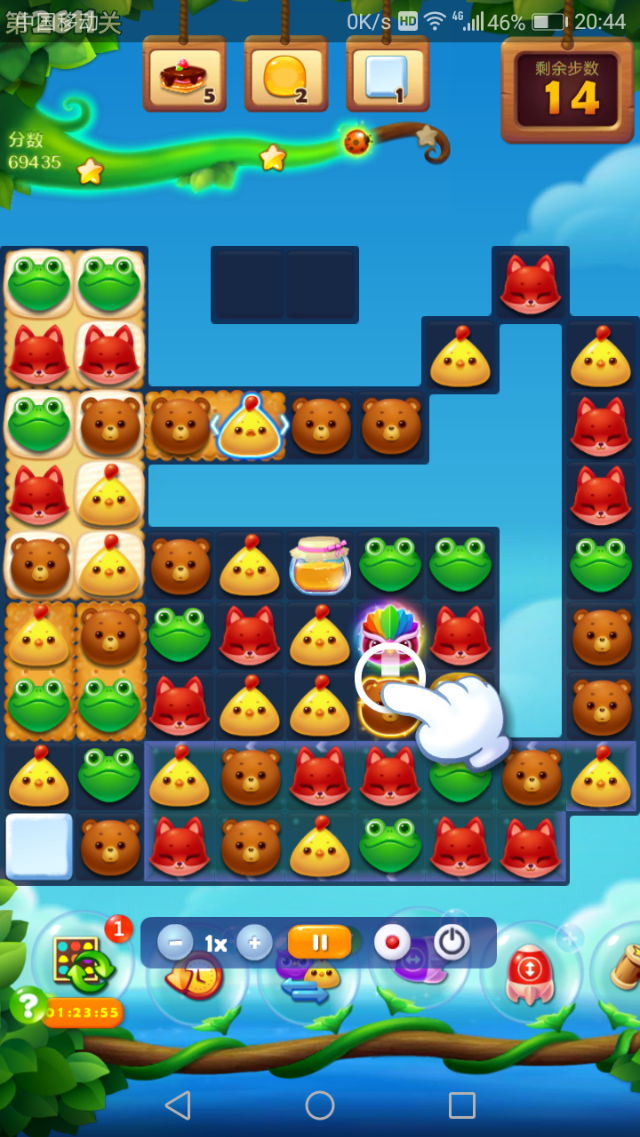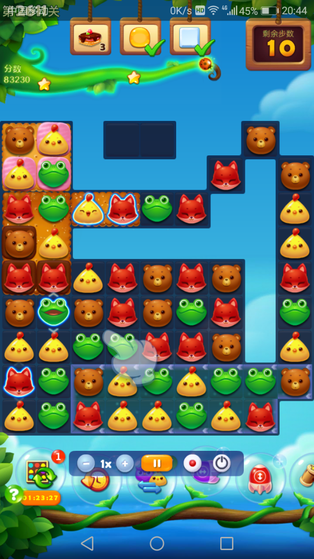双鸟开局后在下方尽量贴着左边走,尽快把左下角4个雪块打掉,然后在最左边两列组竖向特效做饼干。
